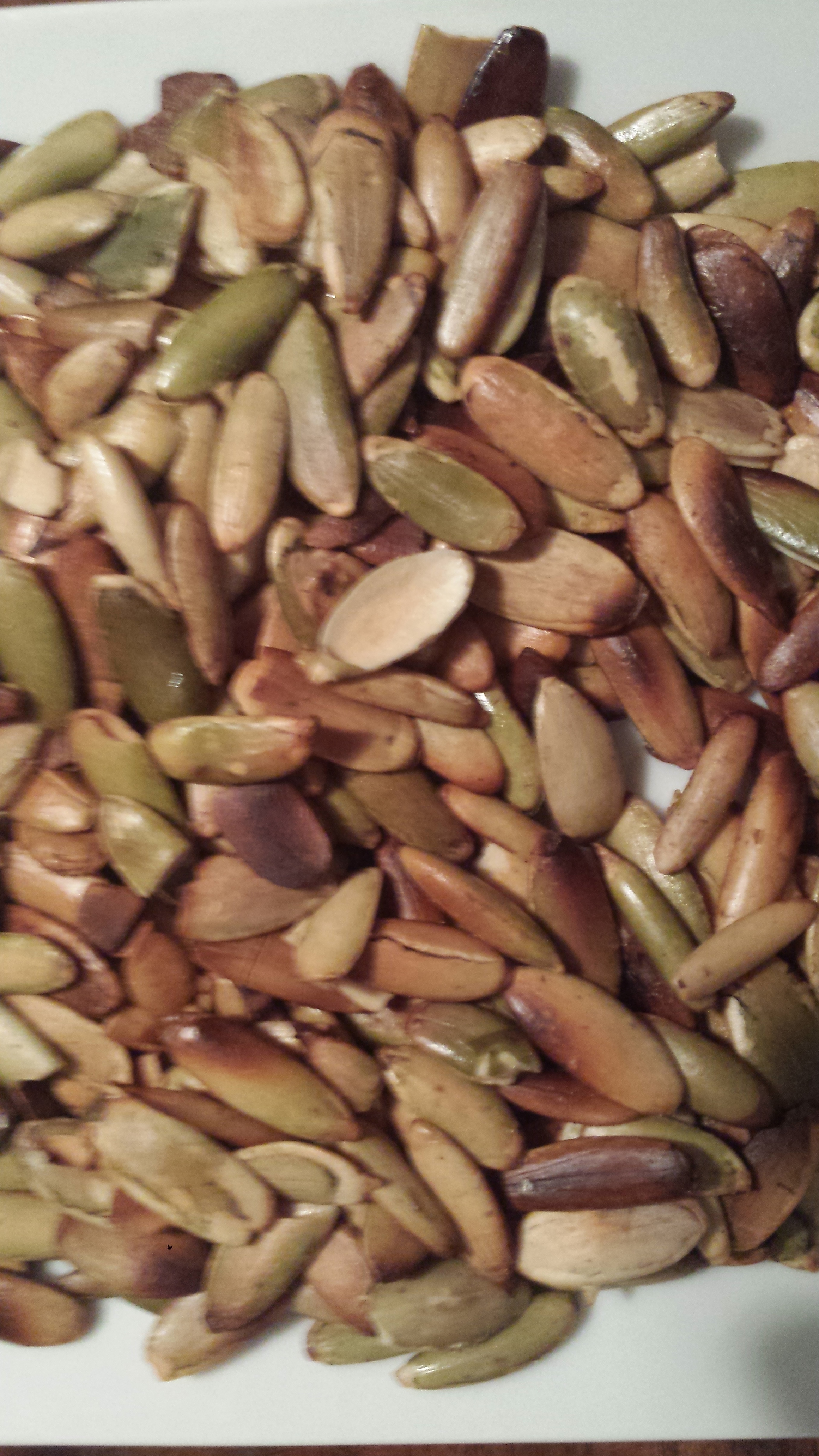 - Toast the pumpkin seeds in a small, dry saute pan over medium heat for a couple of minutes until they are golden and lose their raw taste. Let cool.