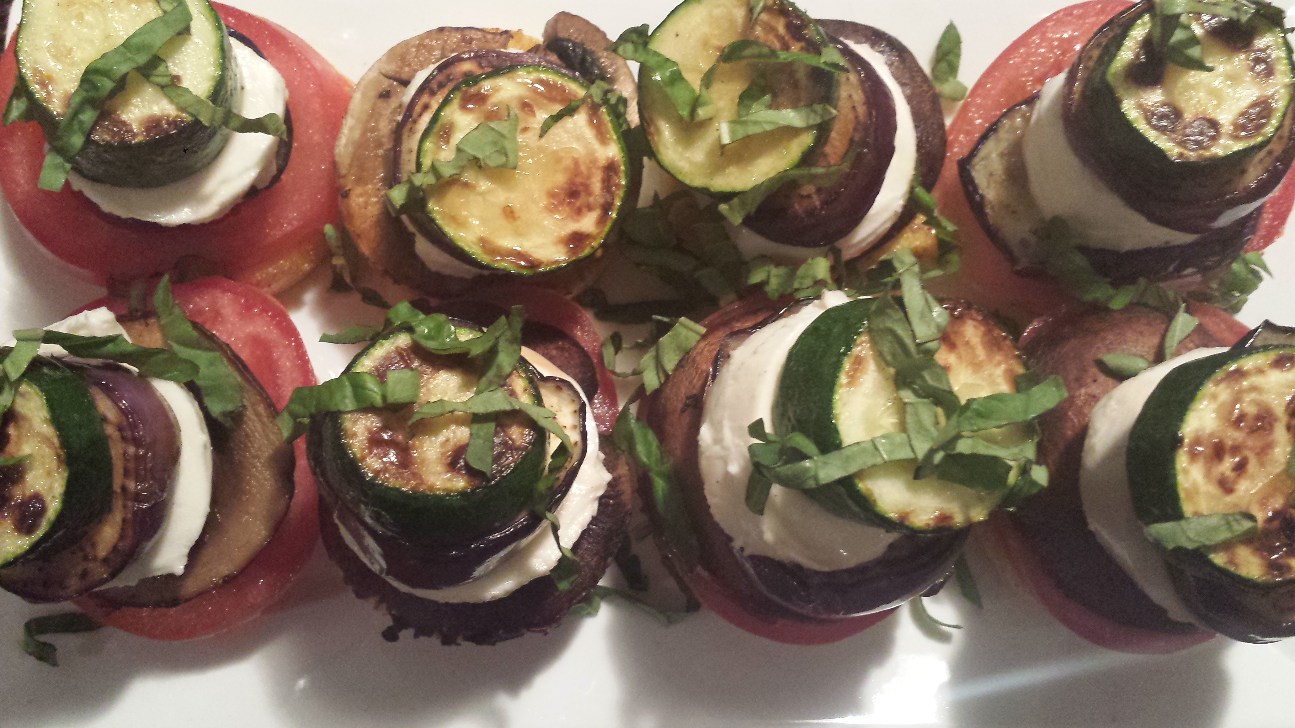 - To assemble the ‘towers’, ladle ½ cup marinara sauce onto the middle of a plate. Place a polenta circle on top of the sauce, then top with mozzarella, tomato, eggplant, mushroom and zucchini, depending on their size. I usually go from biggest on the bottom to smallest on the top.