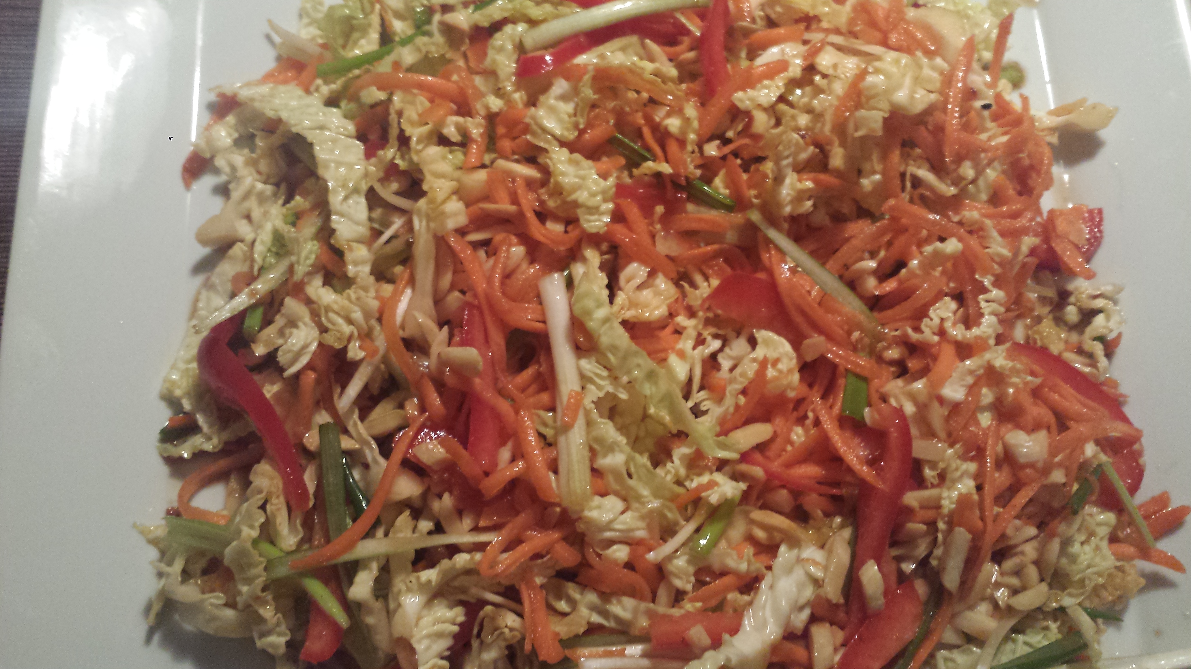 Slice red pepper and napa cabbage thinly and separate. Julienne carrot(a Cuisinart or mandolin makes it easy). Cut scallions into 2 or 3 inch sections and sliver. Combine all ingredients.