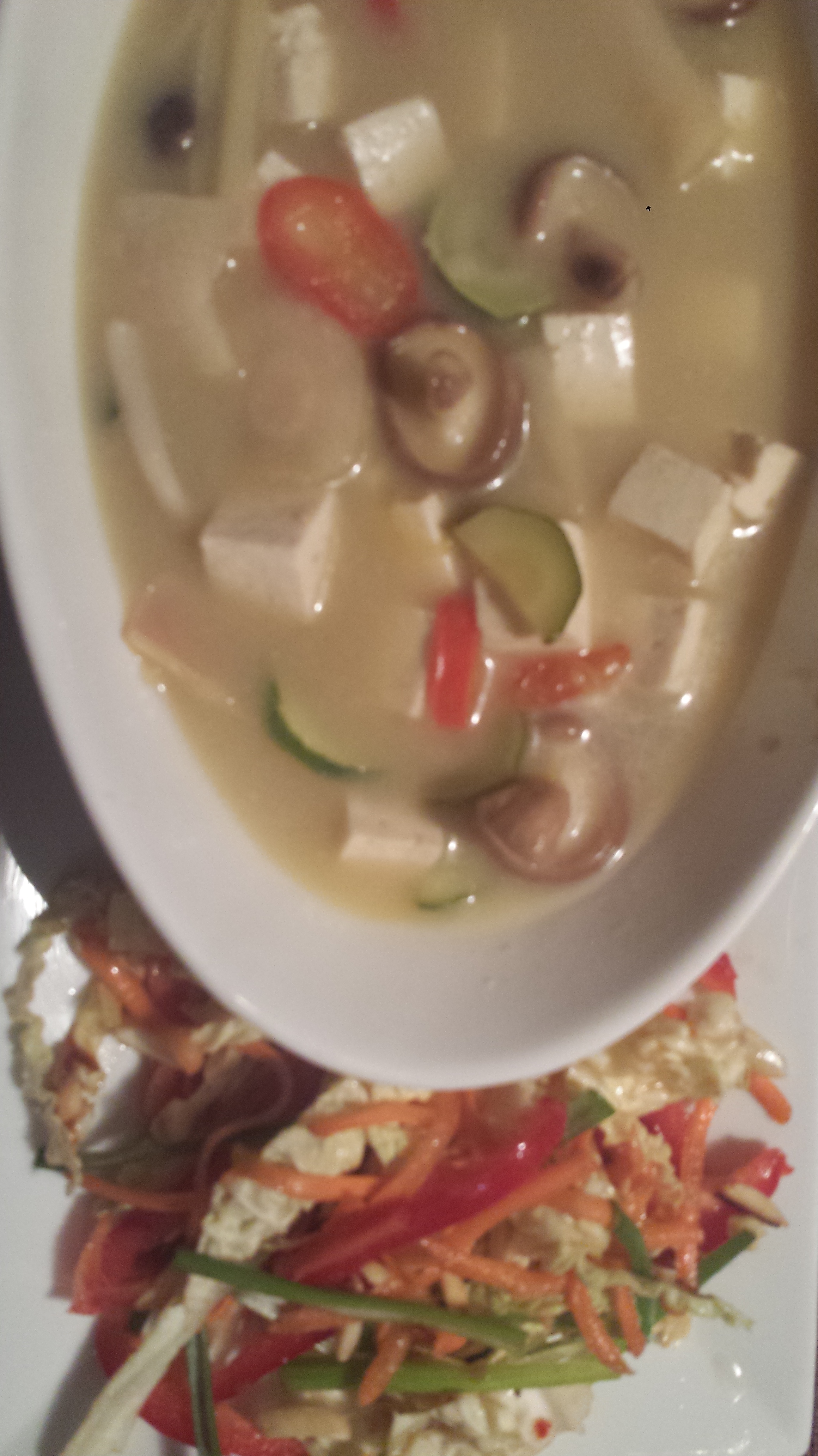 Tom Kha Gai, or Thai Coconut Chicken soup is a very flavorful soup usually made with coconut milk, galangal and lemongrass. I had it the first time in the 80’s at San Francisco’s Thep Lela Restaurant and fell in love. I wanted to try a vegetarian version so opted for Tom Kha Teohu (tofu). Tofu works really well in this dish, which as a main course is a nice but light dinner. I paired it with a Thai inspired salad featuring napa cabbage and other julienned veggies tossed in a spicy Asian style vinaigrette.
