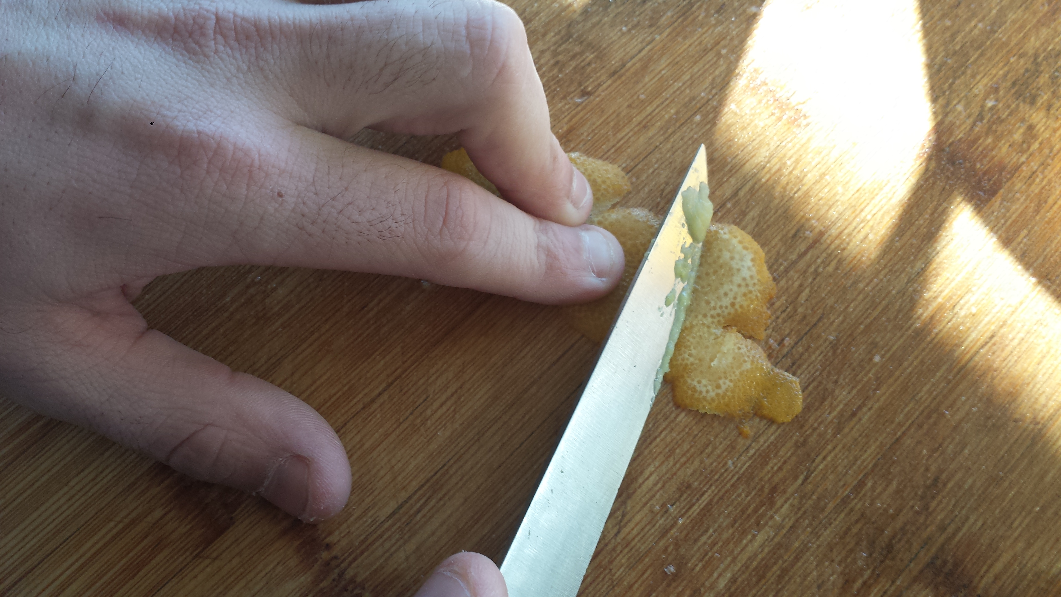 •  Using a potato peeler, zester or a microplaner, carefully remove the peel trying not to get any of the bitter white pith. I used a potato peeler to cut long strips and then scraped any white from the back with a sharp knife.