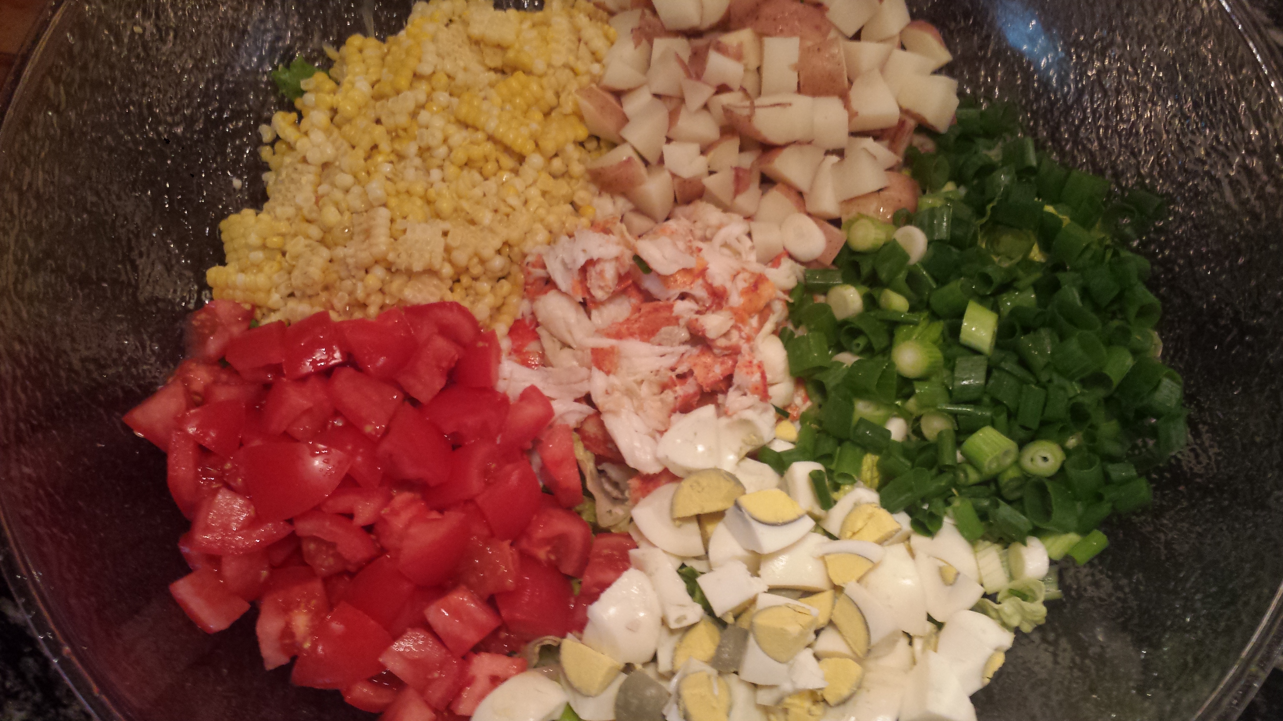 One of the nice things about a traditional lobster bake is the leftovers!  The next day I made a composed salad with the remaining lobster, eggs, potatoes and corn cut off the cob.  I added some chopped tomatoes and scallions and arranged it all on a bed of fresh romaine.