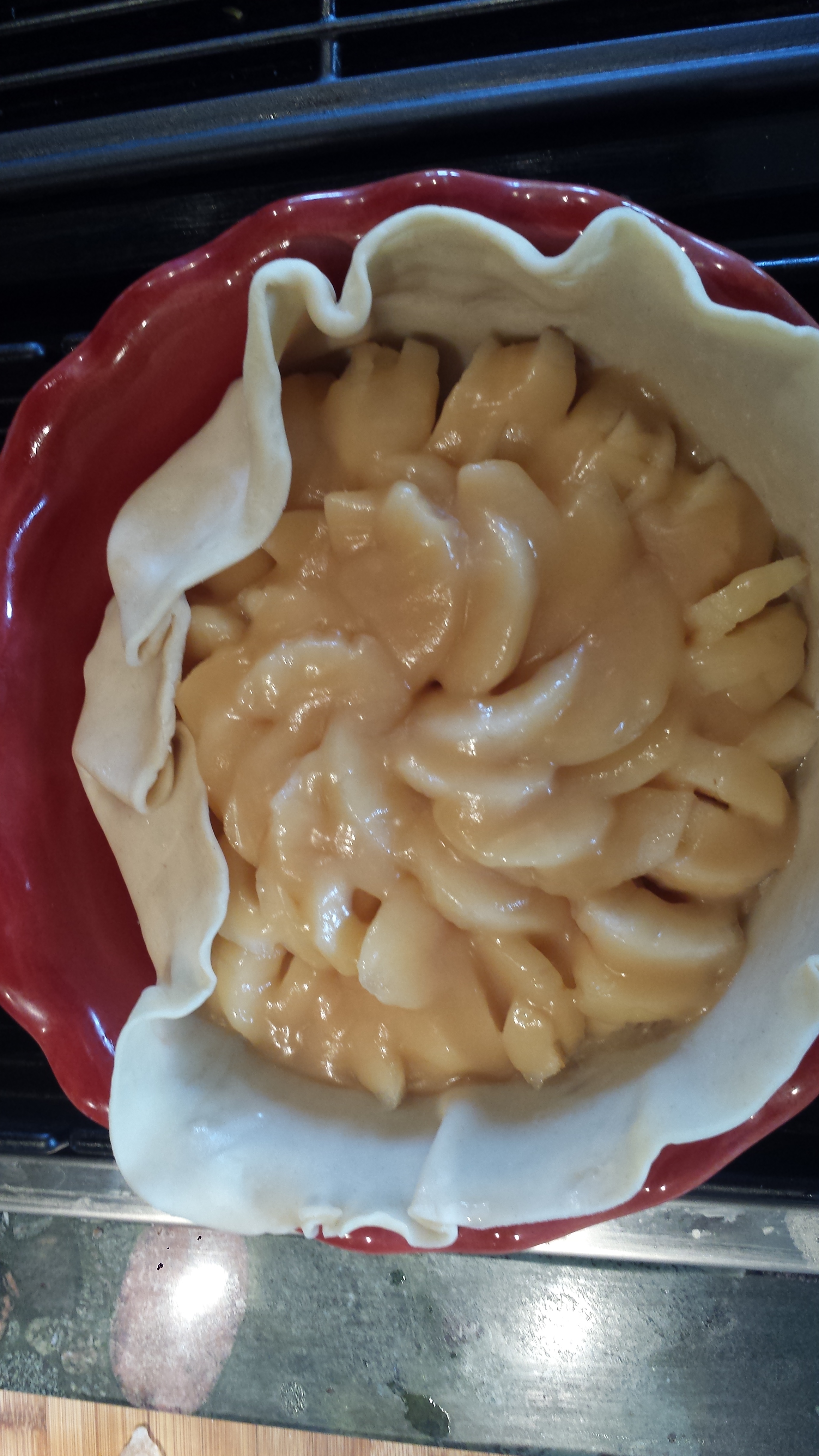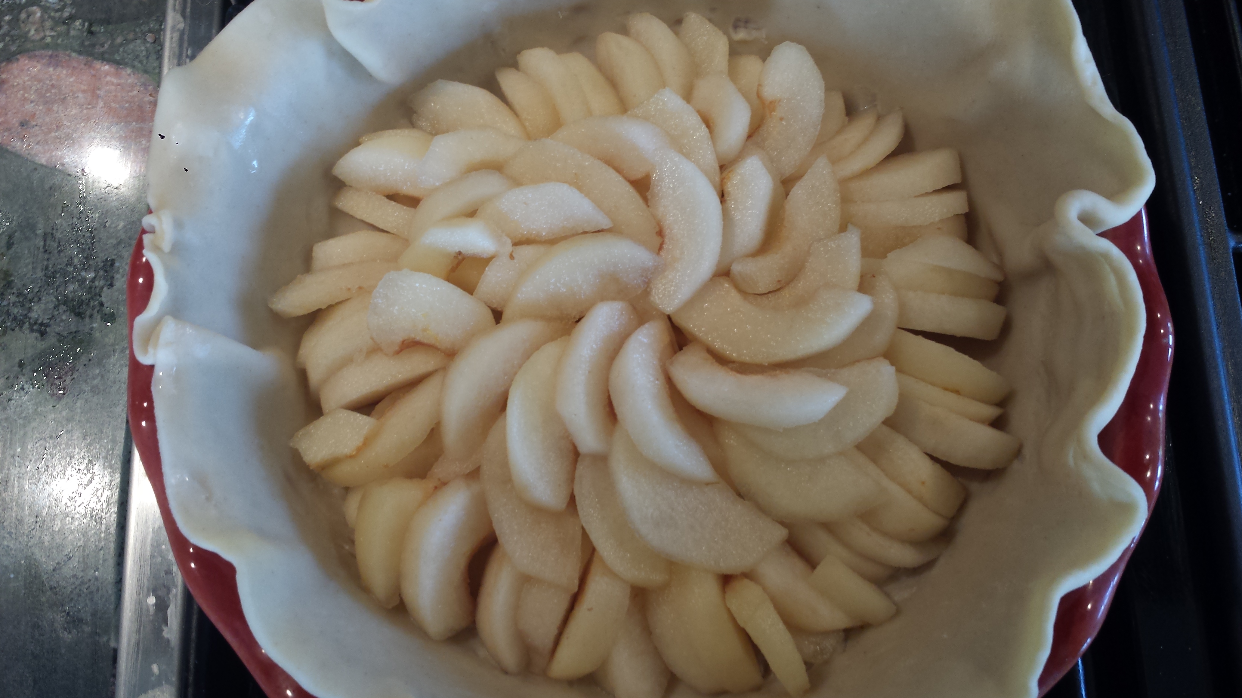 • Dry the pear halves and slice them into the pie crust.  You can arrange them in concentric circles starting at the outside and working your way into the center (with the small ends toward the center).  Or you can throw them in free form.  It will taste the same.