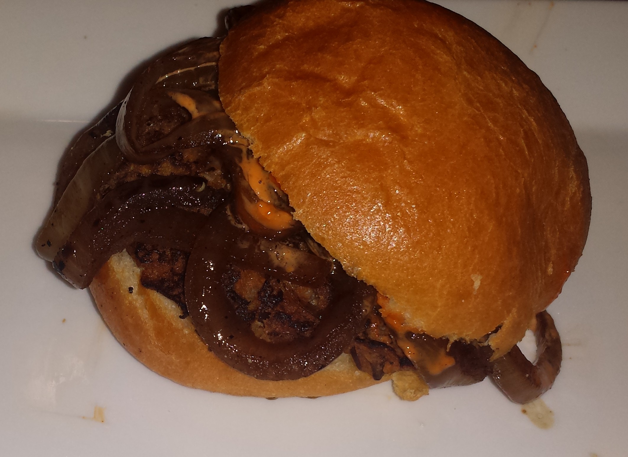 - Slice open the bun and place a burger on the bottom and top it with a generous spoonful of onions. Spread the top half with sriracha aioli.