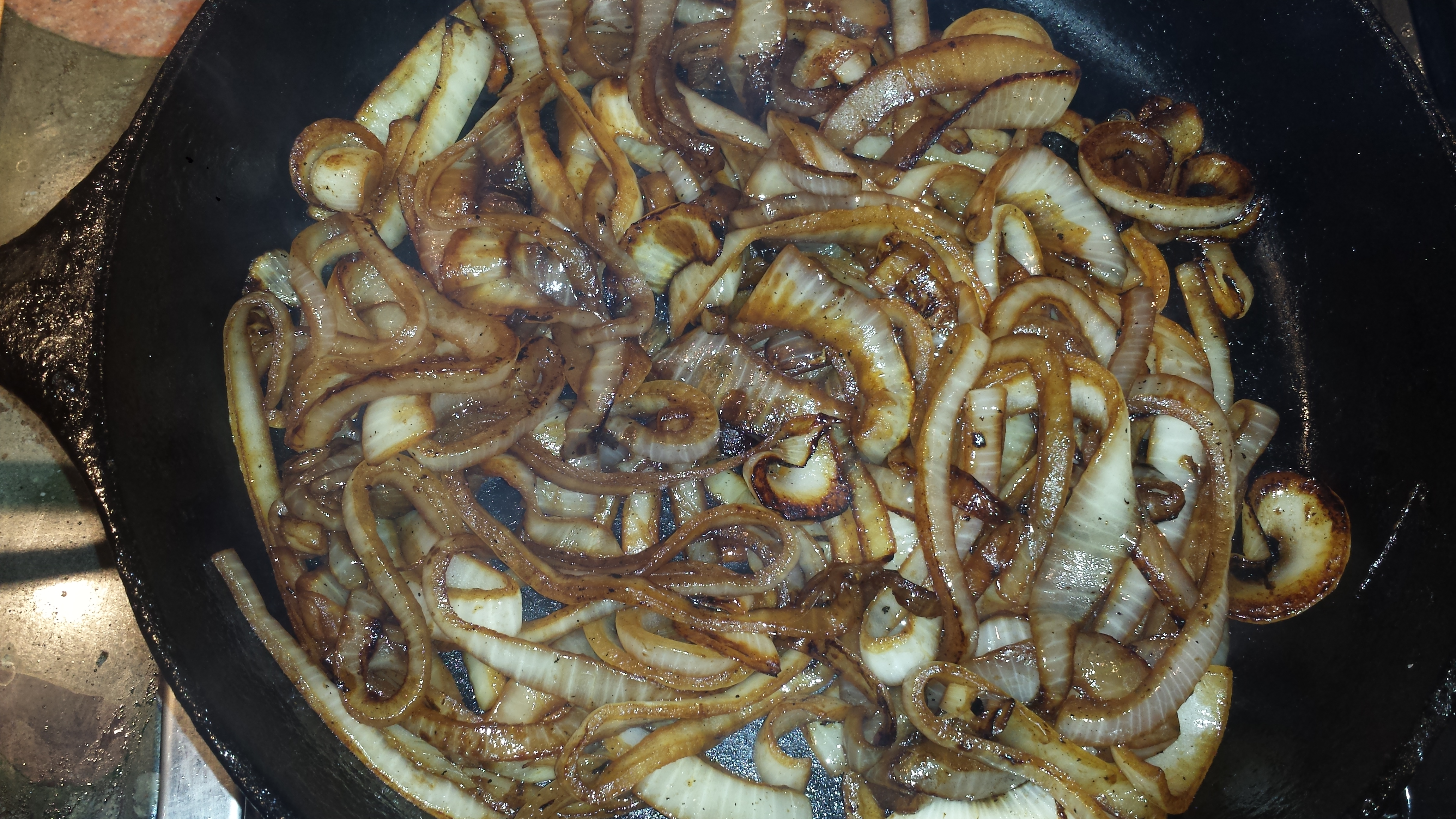 - If using carmelized onions, slice onion and cook on medium high heat with oil 4 or 5 minutes, until browned and softened. Add a splash of balsamic vinegar and cook until liquid has absorbed. Remove from heat.
