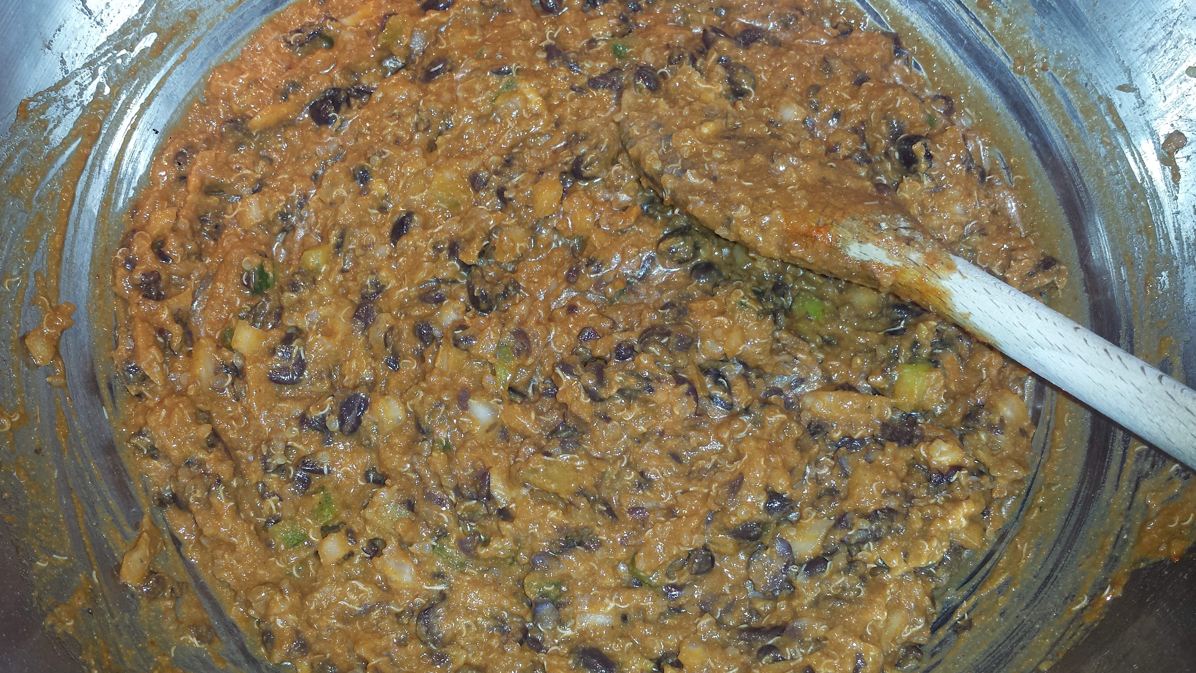 - Rinse the black beans in a strainer and add them to a large mixing bowl. Add cooked quinoa to the bowl. Mash or blend the black bean-quinoa mixture into a paste.
