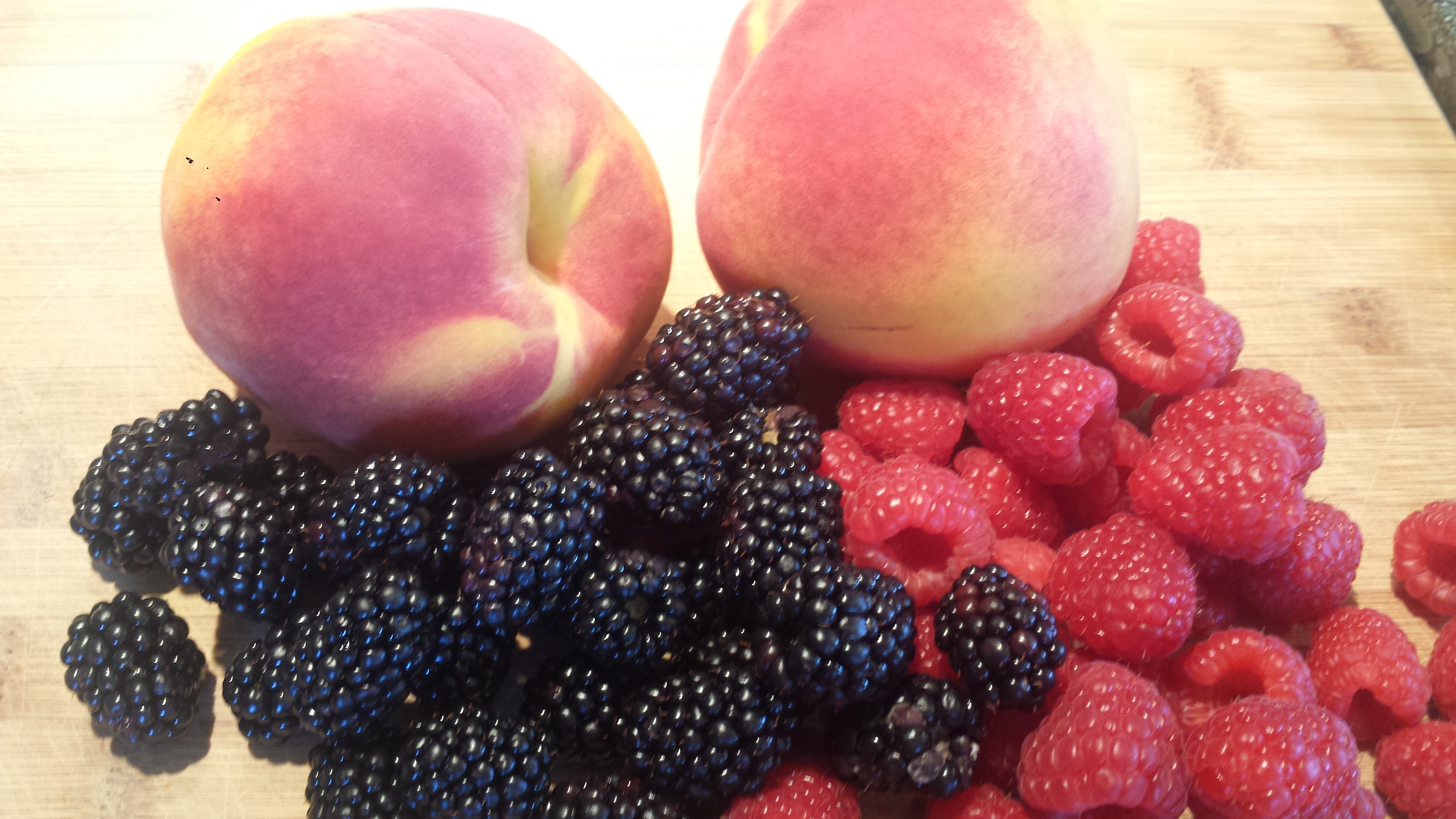 This is a super easy recipe. You can use any fruit you have on hand. If its sour just add a bit more sugar. If its really ripe add a bit less. I used peaches, raspberries and blackberries because that is what I had. The beauty of a crisp is that there is no bottom crust to add calories and carbs. It’s really all about the fruit. I topped the fruit with a sweet crunchy oat almond topping but pecans and walnuts are also good options. For a more streusel-like topping use half flour, half oats.