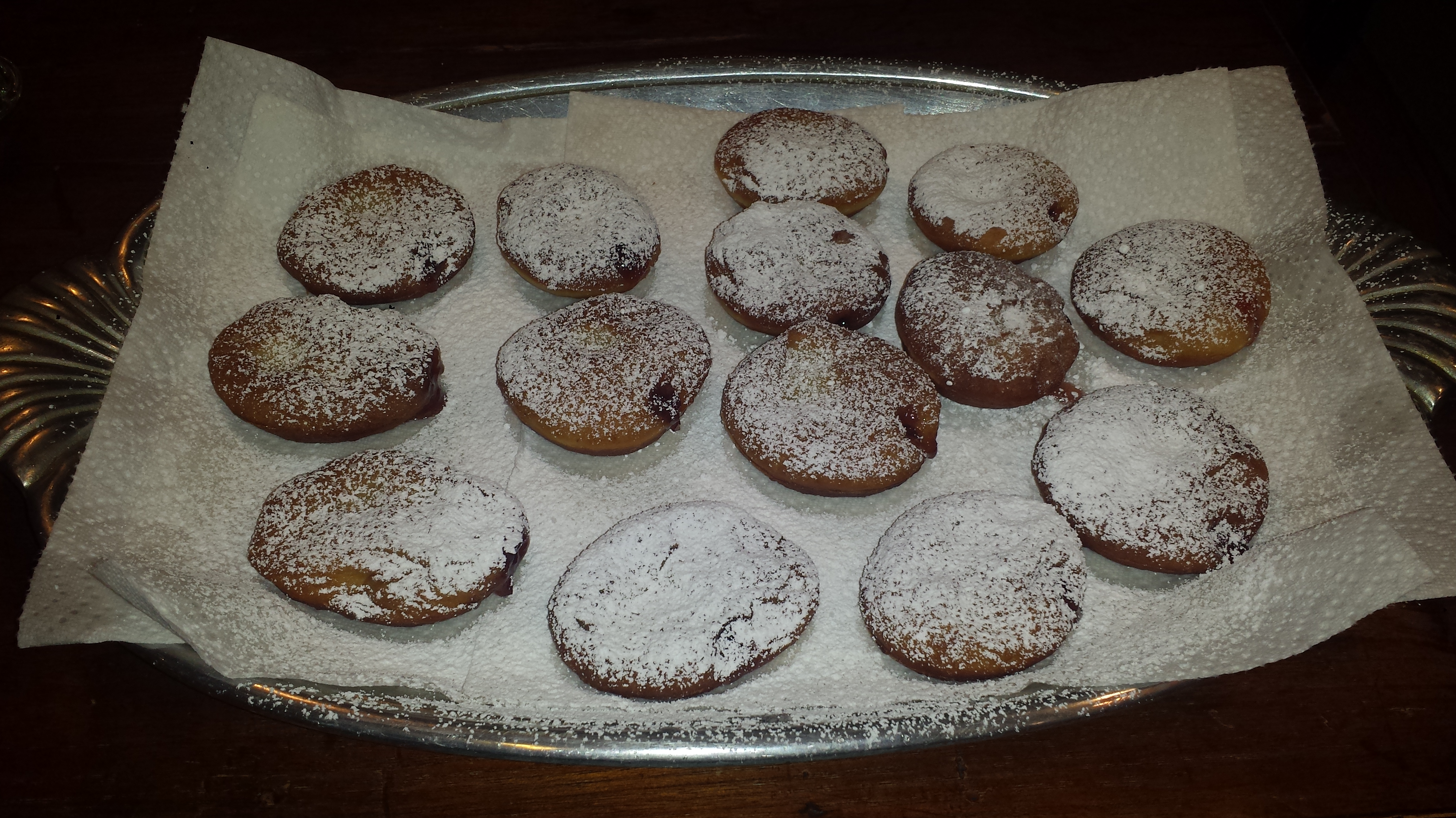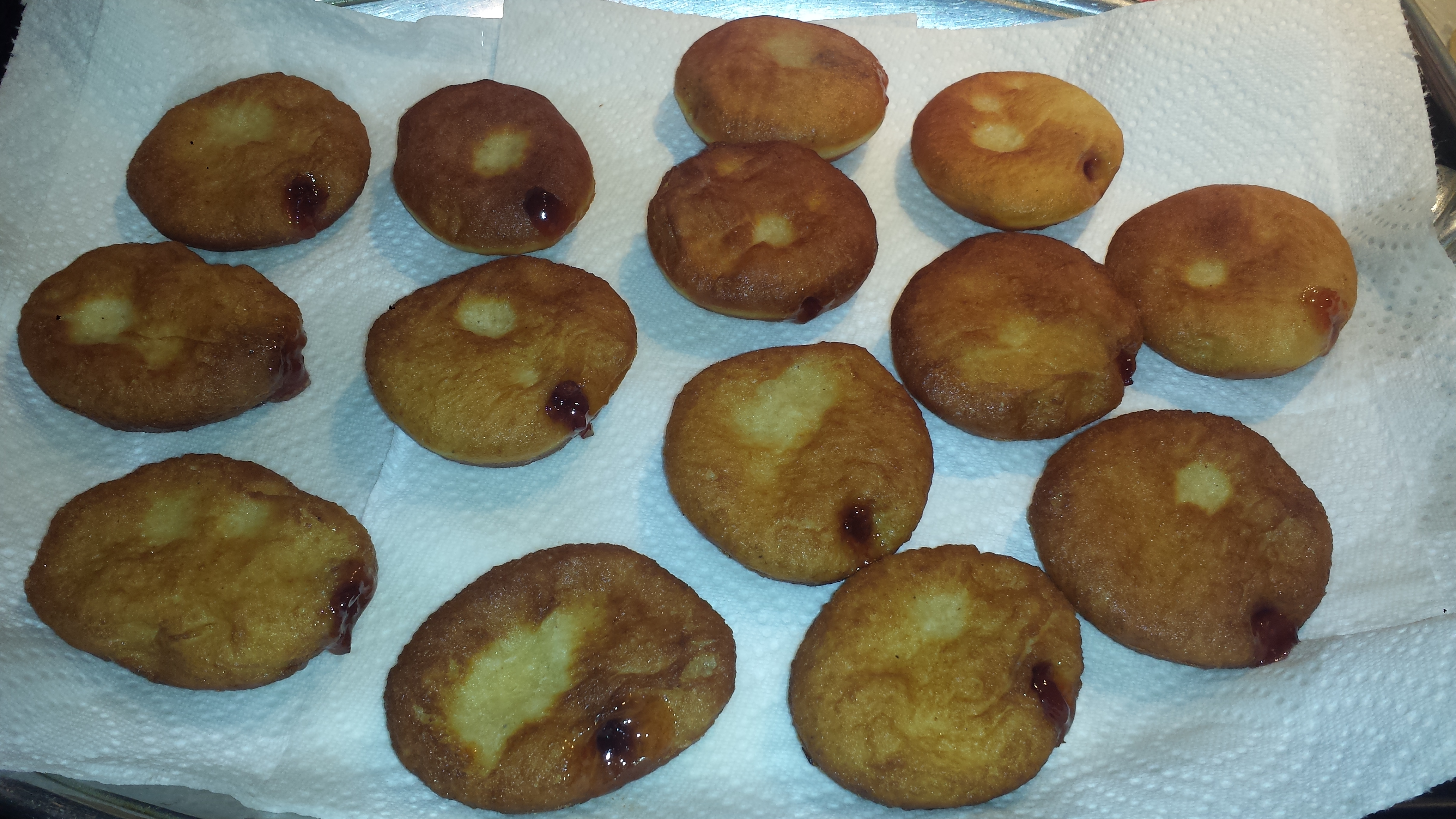 Since I couldn’t find my recipe, I turned to “The Mile End Cookbook – Redefining Jewish Comfort Food from Hash to Hamantaschen” given to me by my friend, Karin, for my birthday. It’s a great cookbook filled with recipes for all kinds of dishes I have heard of (mostly from my Mother in Law) but never knew what they were, like Kasha Varnishkes and Kreplach. By the way, for those left wondering, they are a noodle/grain dish and meat dumplings, respectively. “The Mile End Cookbook” offers an easy recipe for Jelly Doughnuts, called Sufganiyot in Hebrew. These doughnuts are light and delicious but not too sweet, although that is partly determined by the type and quantity of the jelly that is used. I used a Santa Rosa Plum jam that I made last year from plums from my garden, which is a blend of sweet and tart that offsets the sugar nicely. A strawberry or grape jelly will yield a sweeter result.