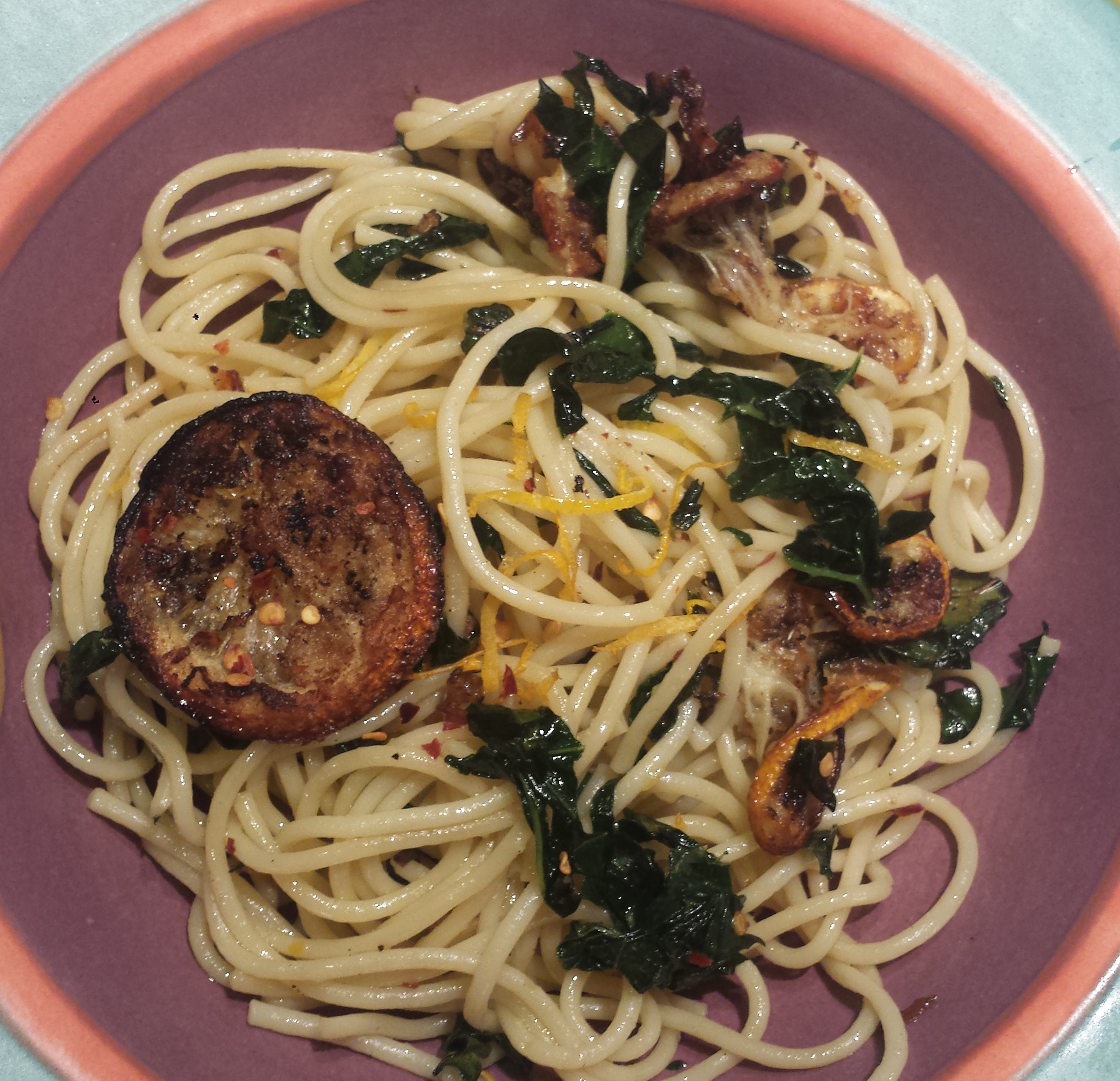 PASTA WITH FRIED LEMONS, KALE AND CHILI FLAKES