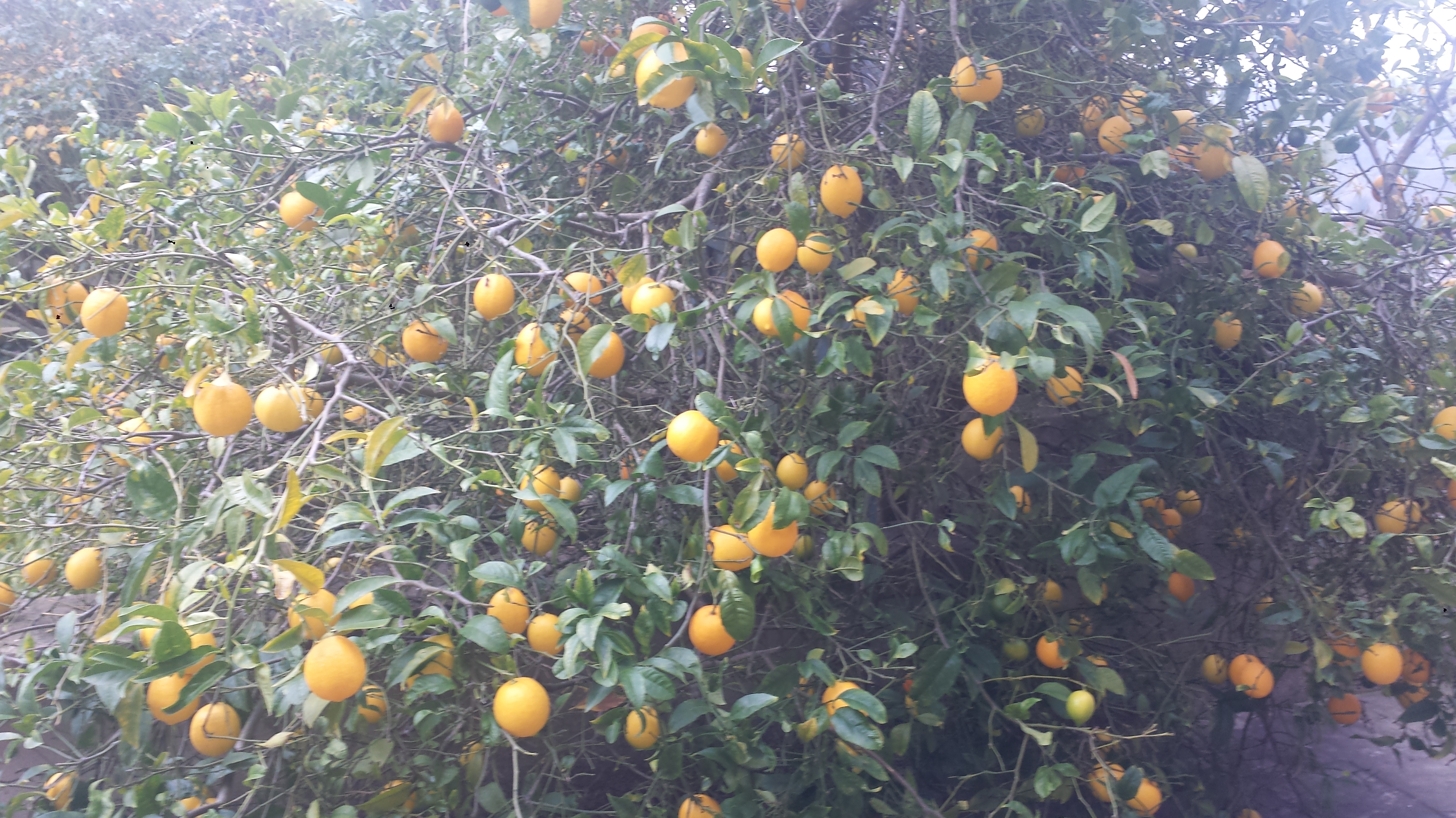 Fried Lemon? Yes, you read correctly. Even the lowly potato is turned from wallflower into the life of the party when fried in oil, so just imagine what frying can do to a crowd pleaser like the lemon! I have a Meyer Lemon tree outside my kitchen door which is exploding with lemons. Most lemon trees have two crops a year, a summer crop and a winter crop which, surprisingly is the larger of the two. The winter crop is right now so lemons should be plentiful and inexpensive. My freak of nature tree, however, has lemons all year around and right now it is so heavily laden with fruit that branches are bending under the weight. Just take a look at this bounty! I can’t even get the whole tree in the photo. It might be time to make some more Limoncello…