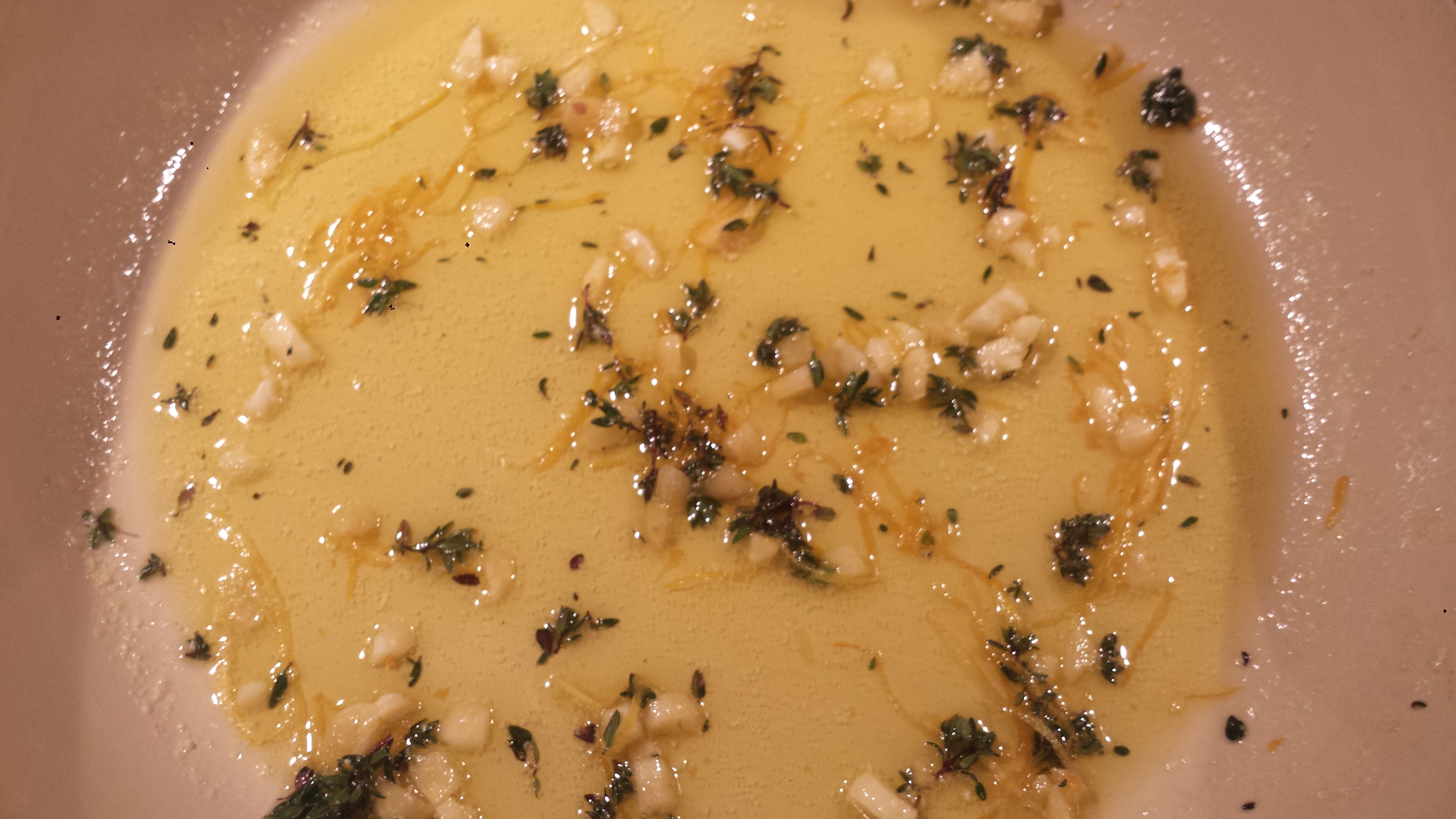 - Heat the butter and oil in a large saute pan over medium heat. Add the garlic, chile flakes, thyme and lemon zest (reserving some for garnish) and cook until fragrant.