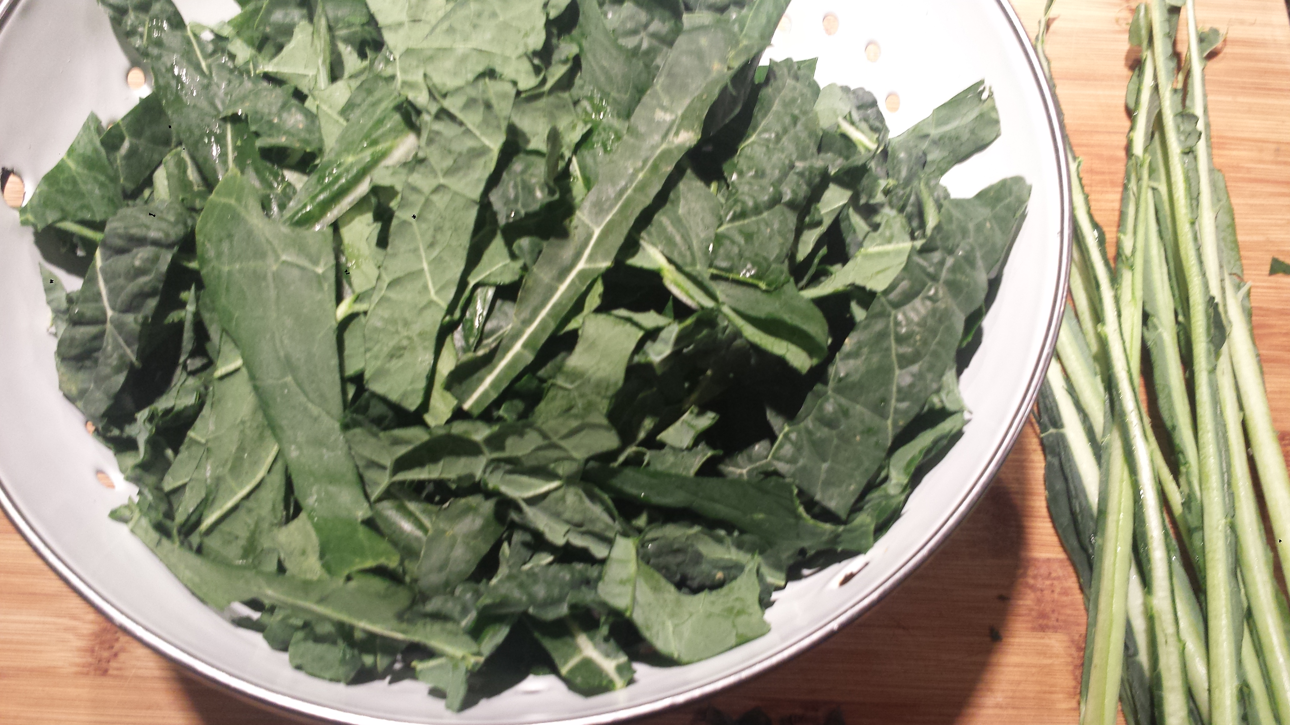 - Cut the center rib from the kale (if using) and slice the kale into 1/2 inch strips about 4 inches long.