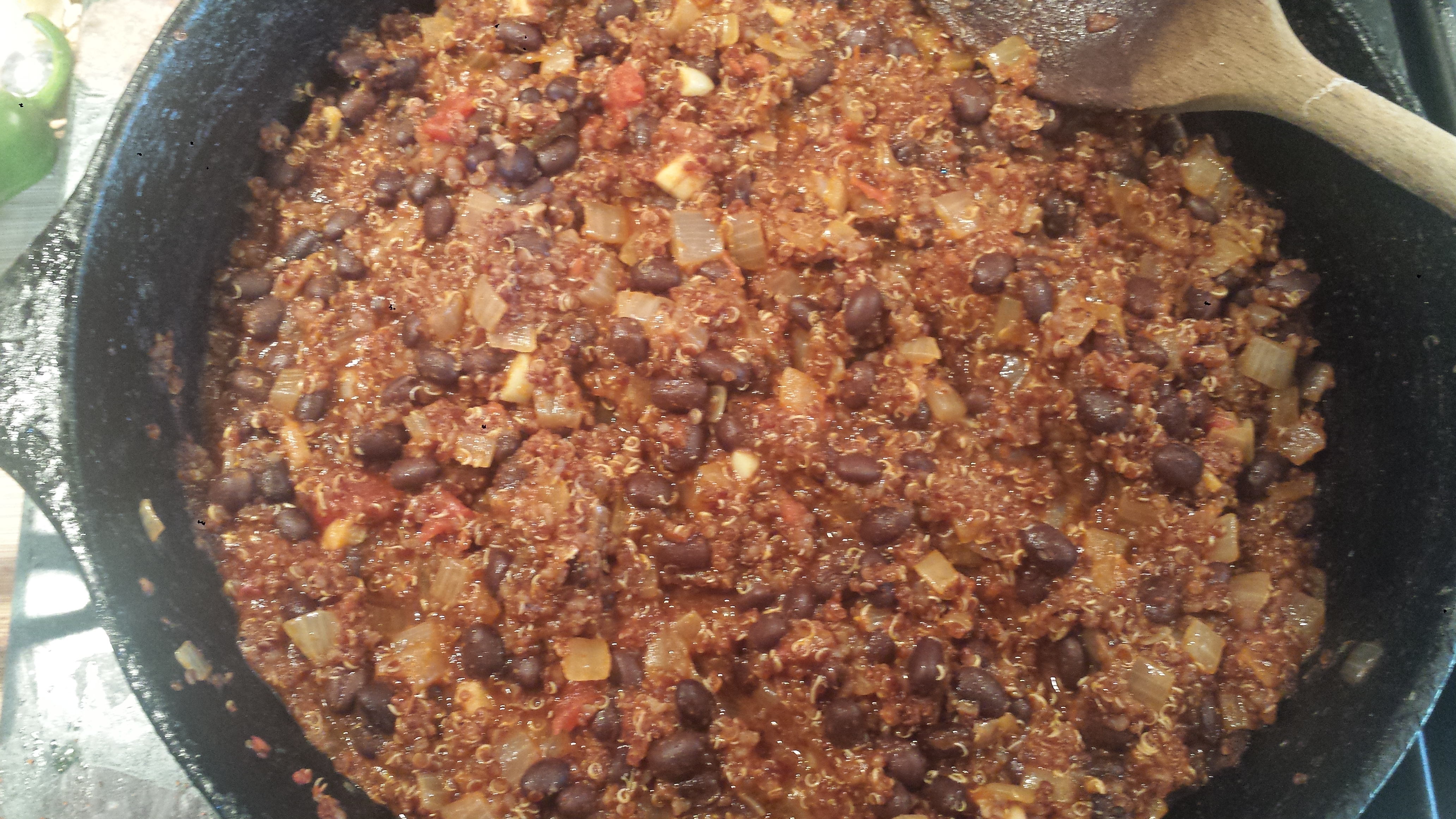 TIPS:  I like to saute the cooked quinoa with onions and garlic before adding the tomato and spices, however, if you are looking for a shortcut (even if its just saving the extra pan to wash). saute the onion and then add the quinoa and 1 cup of water and cook until the water  has evaporated and the quinoa ‘tails’ have come out. Then add the spices, tomatoes, beans and more water if necessary and cook another 5 minutes or so.
