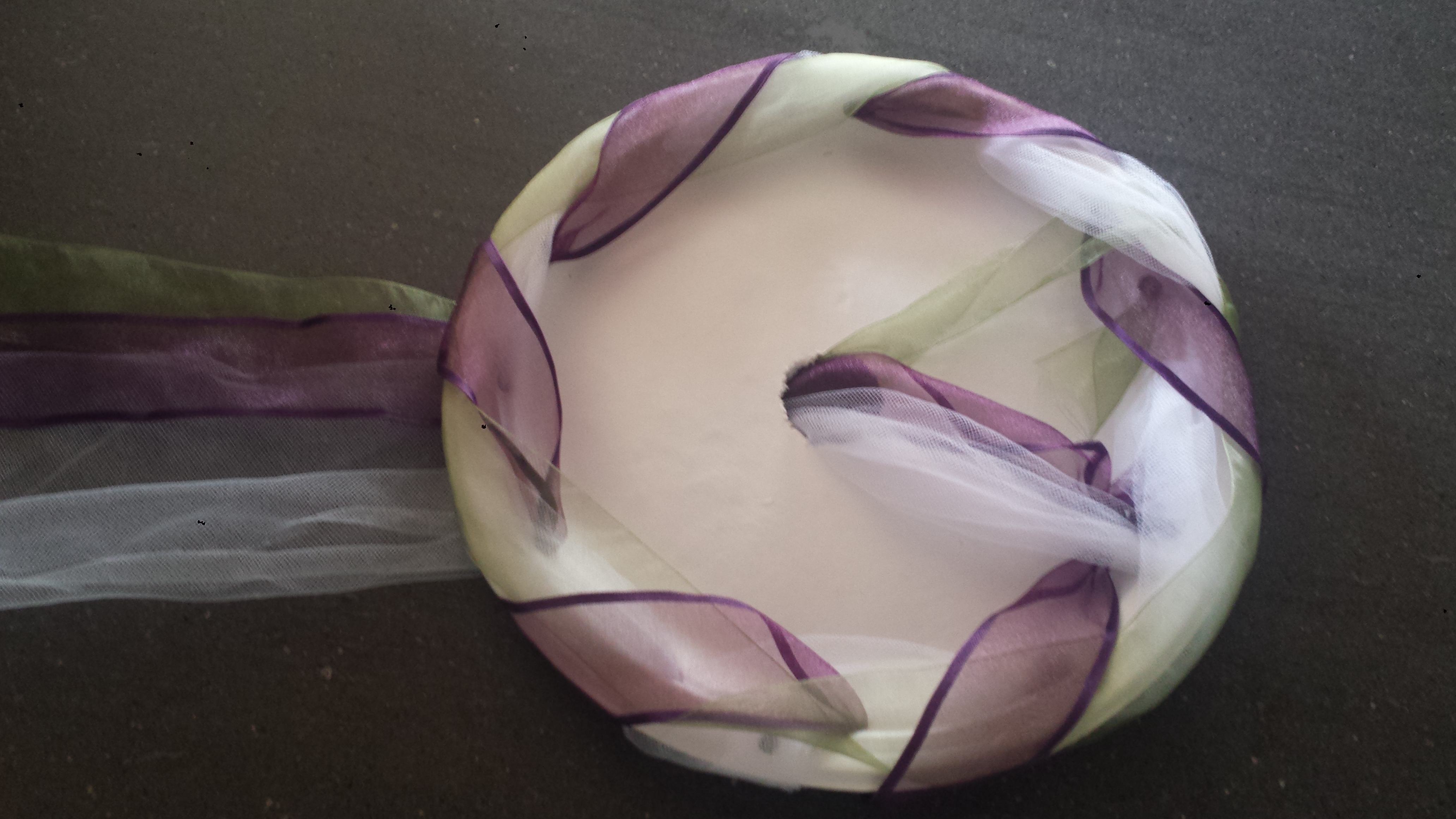 • Repeat with second ribbon making sure all sides of plate are covered. If you want to add a third ribbon, thread it in and out of the other two ribbons into a nice pattern.