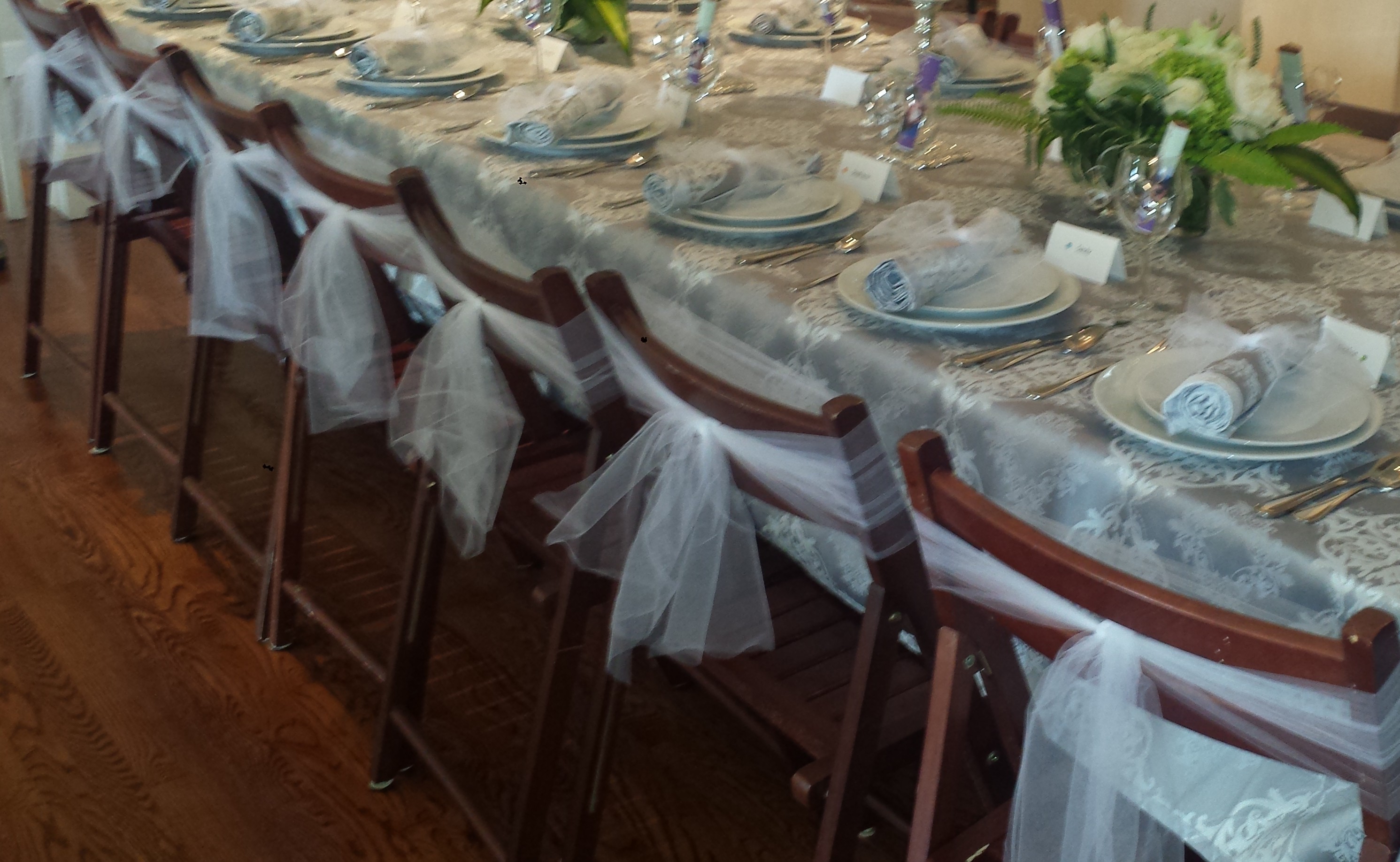 • To hide (enhance) folding chairs, cut tulle into 12-14″ strips and tie to the backs of each chair.