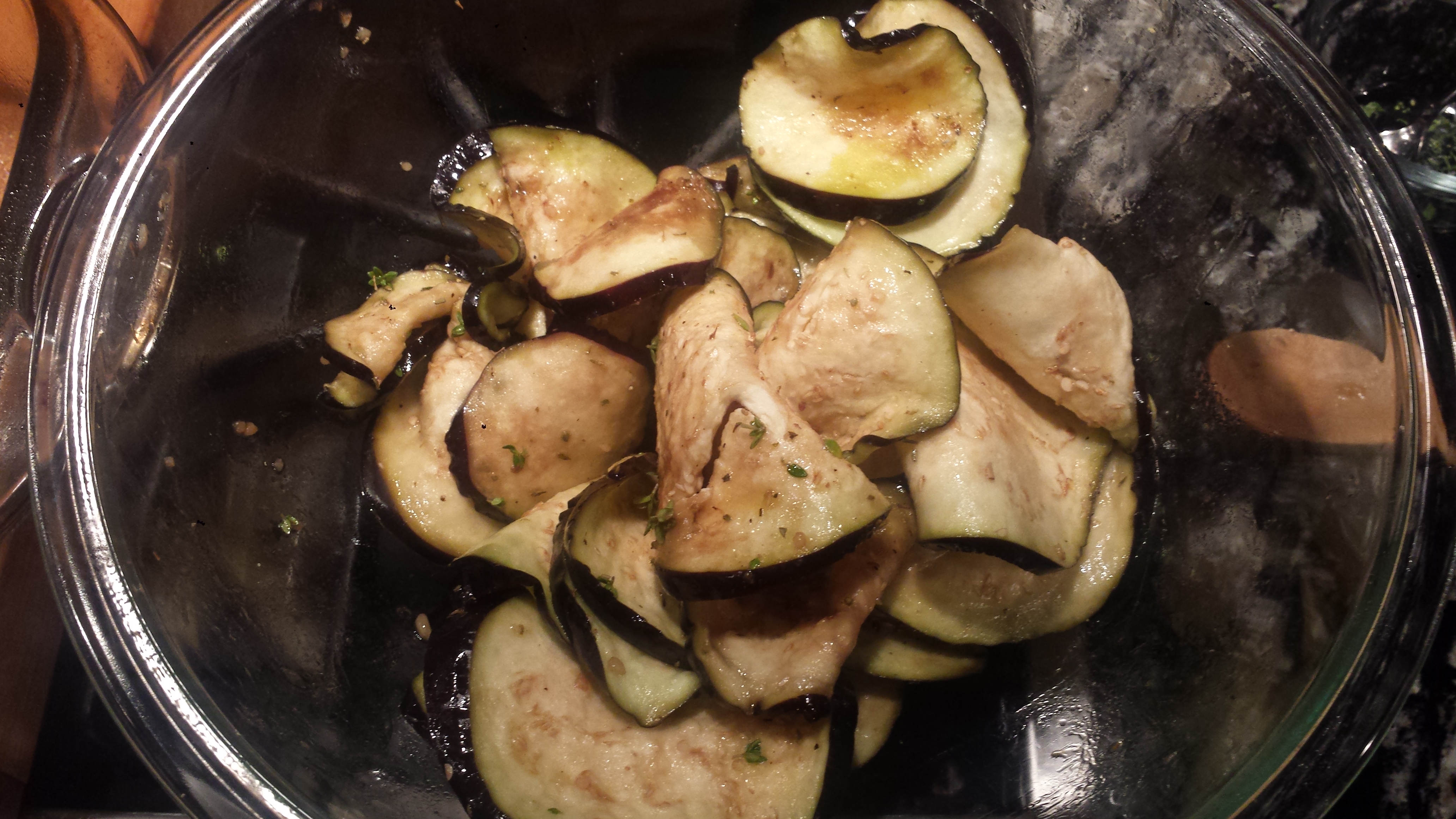 • Combine olive oil, vinegar, garlic and seasonings in a small bowl.  Pour half of the mixture over the eggplant slices and gently stir until all the pieces are coated.