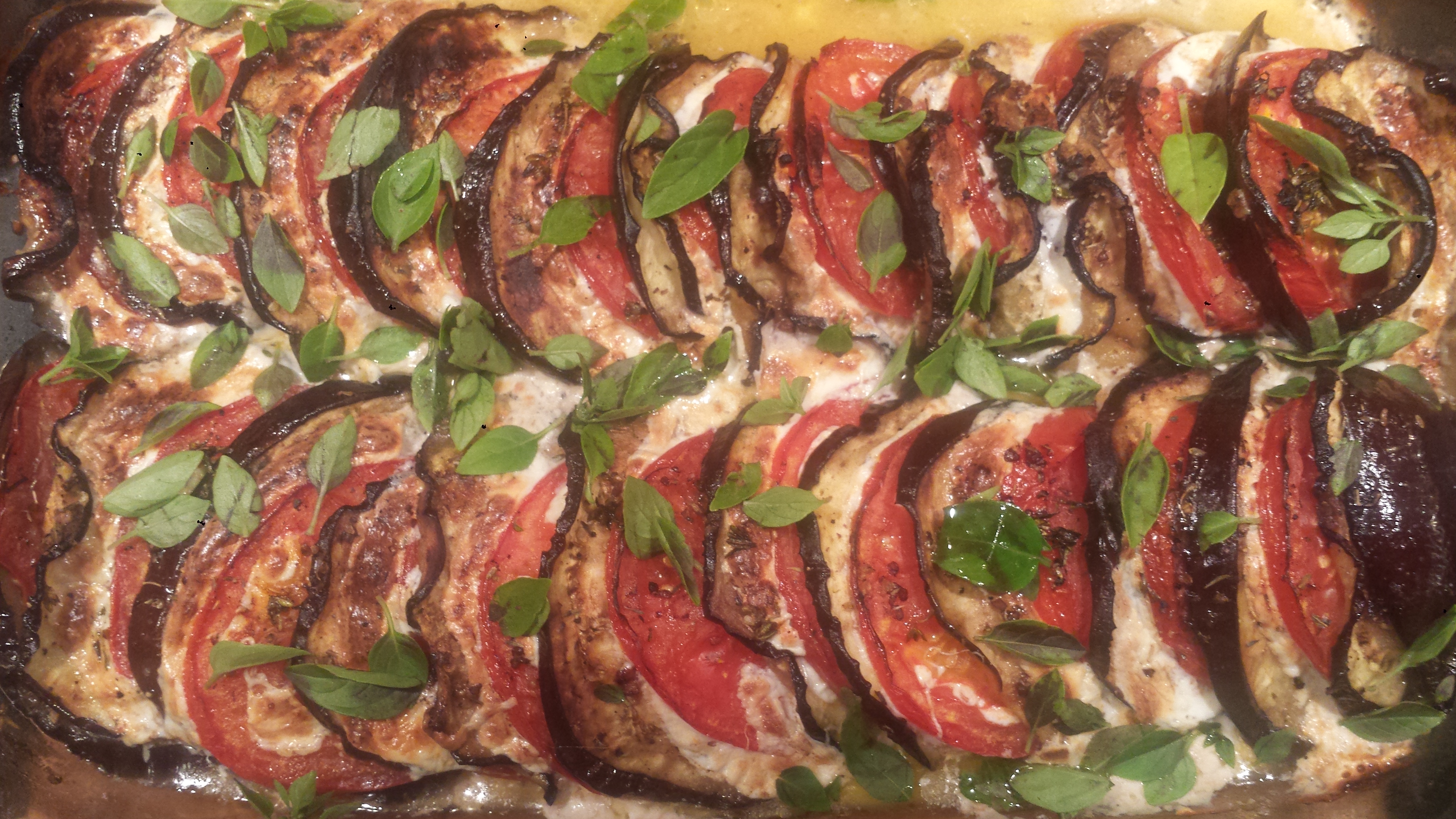 • Complete second row until eggplant and tomatoes are used up.  Drizzle the rest of the marinade over the top taking care to get the tomato slices.  Bake 25-30 minutes at 450.  Turn oven to broil for about 10 minutes, or until tops are browned.