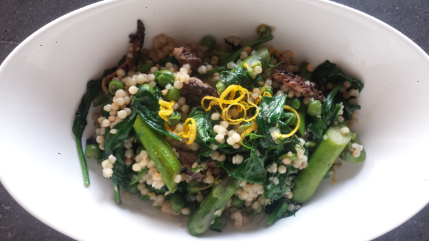 50 Shades of…. Spring. Israeli Couscous, sometimes called pearl couscous (especially in the U.S.) or even Maftoul (aka Palestinian couscous), is the perfect backdrop for this lovely dish featuring spring’s finest; asparagus, baby spinach, morel mushrooms and sweet peas topped with lemon zest and fresh herbs. This is another easy and delicious dinner you can get on the table in about 20 minutes. It’s so pretty it doesn’t look like a nutritional powerhouse but it happens to be loaded with vitamins, minerals and fiber. All of the vegetables are low in fat and calories but high in food value, and all four are surprising sources of protein. Morels are also a great source of Iron and Vitamin D. For another boost of nutrients use whole wheat couscous.