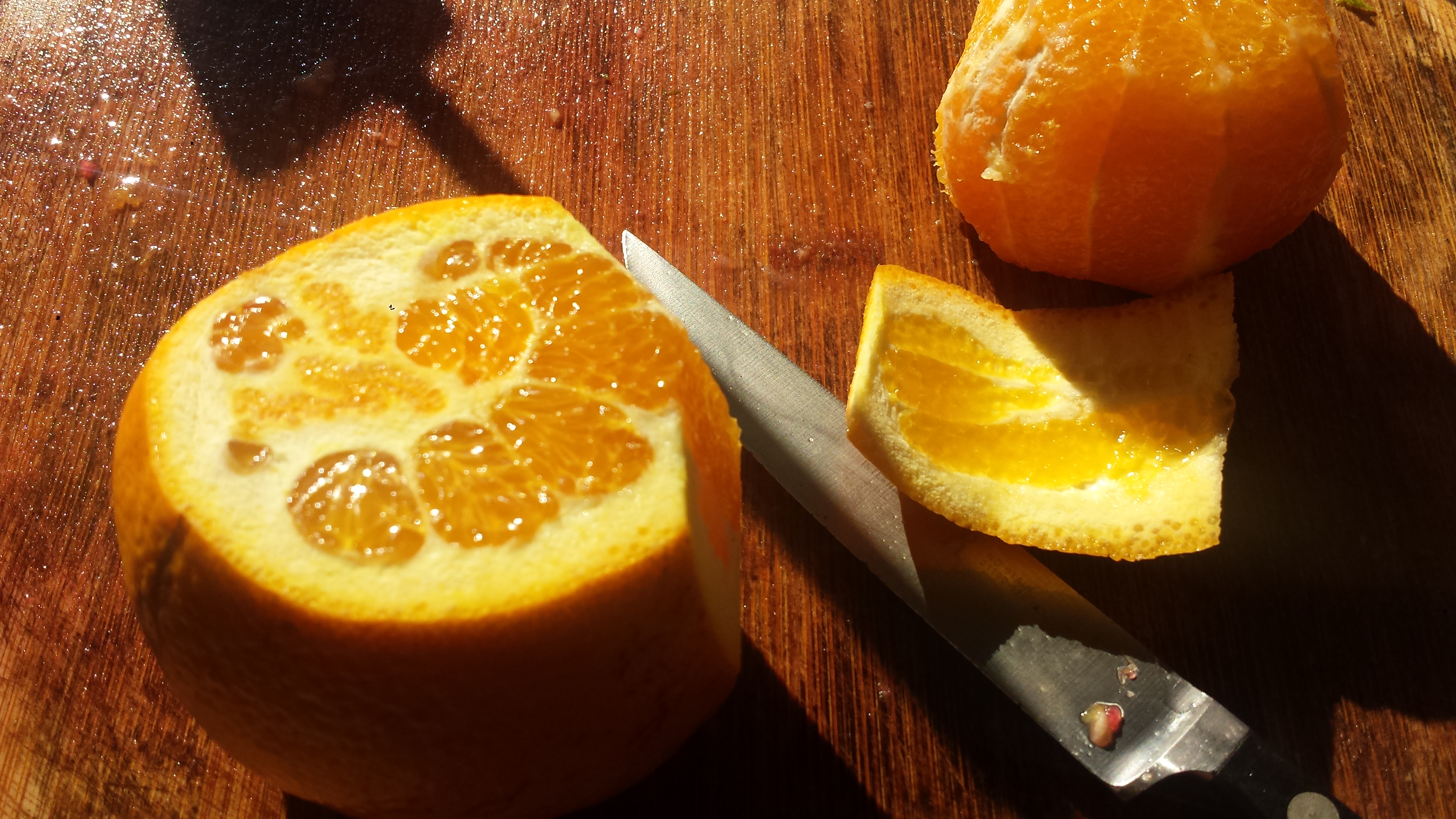 - Cut the ends off orange and remove the peel by cutting in a downward motion going all the way around. Cut into wheels and then sections. Place in a large bowl.