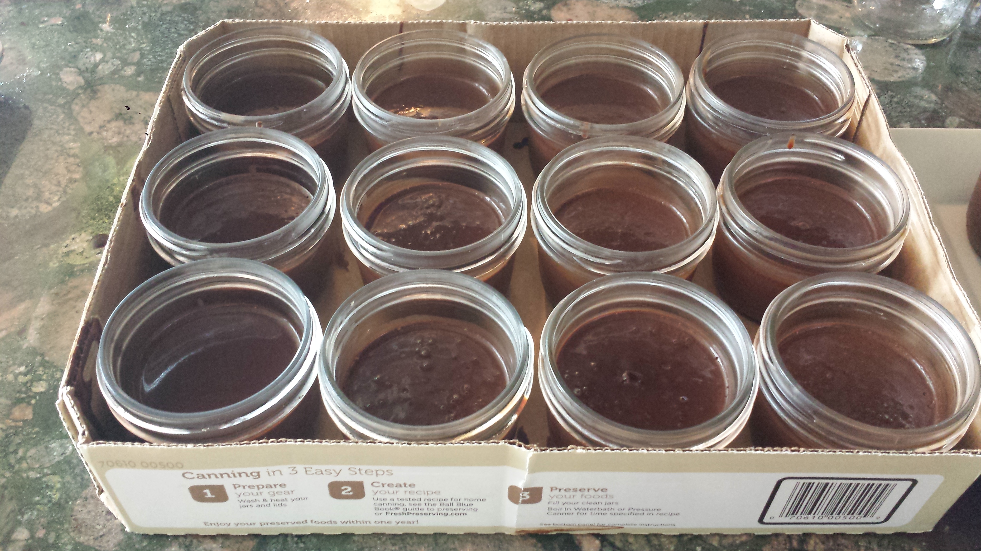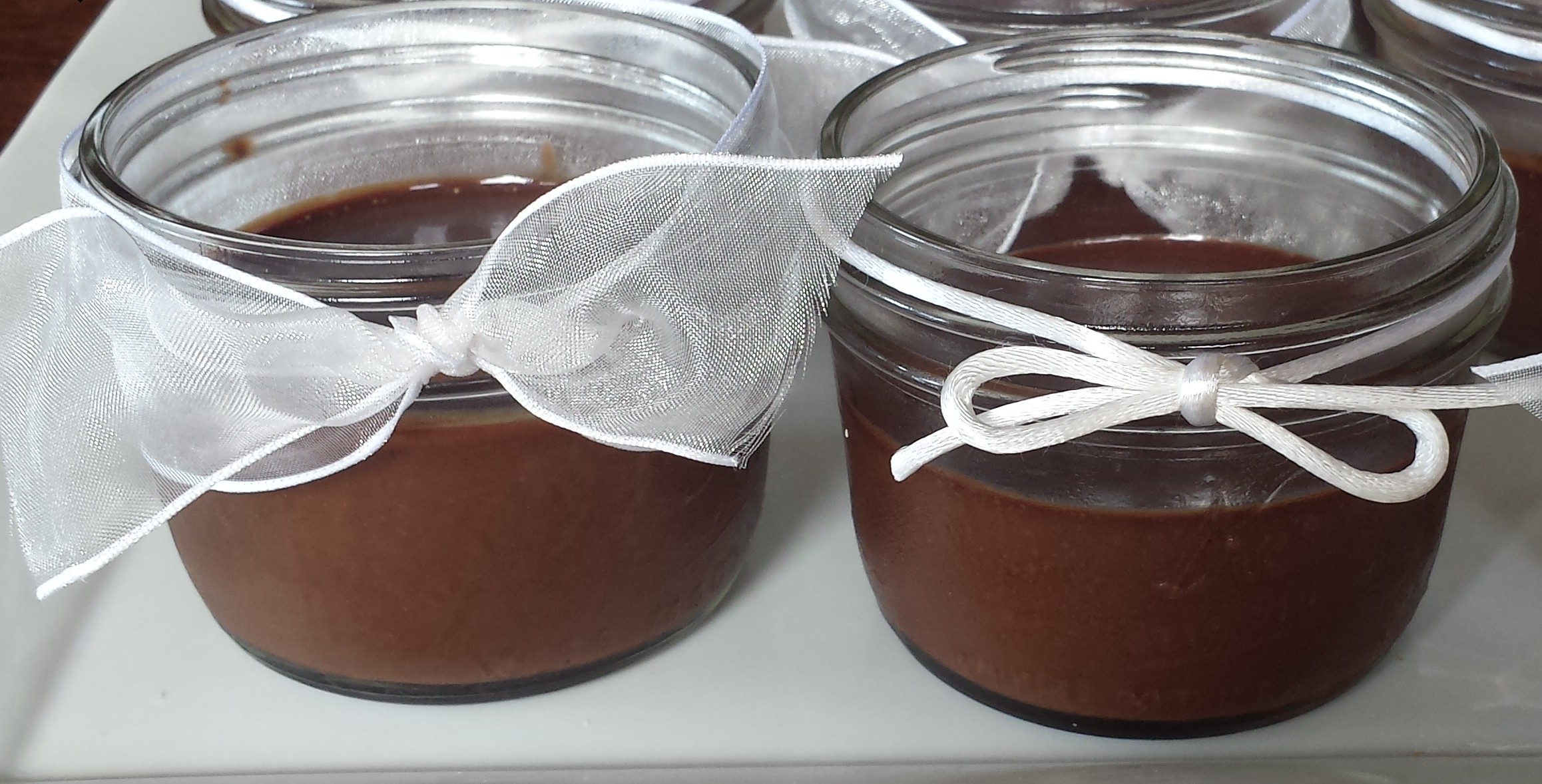 If you can boil water and you have a food processor, you can make this foolproof, no-cook chocolate mousse. You just have to plan ahead by at least three hours because it needs chilling time to set. I didn’t have a dozen of any appropriate dessert dish so I ran down to my local hardware store and bought a box of half pint wide mouth glass canning jars, also commonly known as ‘jelly jars’, which are inexpensive and re-usable. Best of all they are easy to decorate. (Thanks Dawn!).This was for a bridal shower so I went with White Tie and Bridal Veil Bow, using white satin cording and wired organdy ribbon, but it’s very easy to adapt for any holiday. The ribbon you choose really sets the theme. Or you can leave the glass jars plain for a rustic look.
