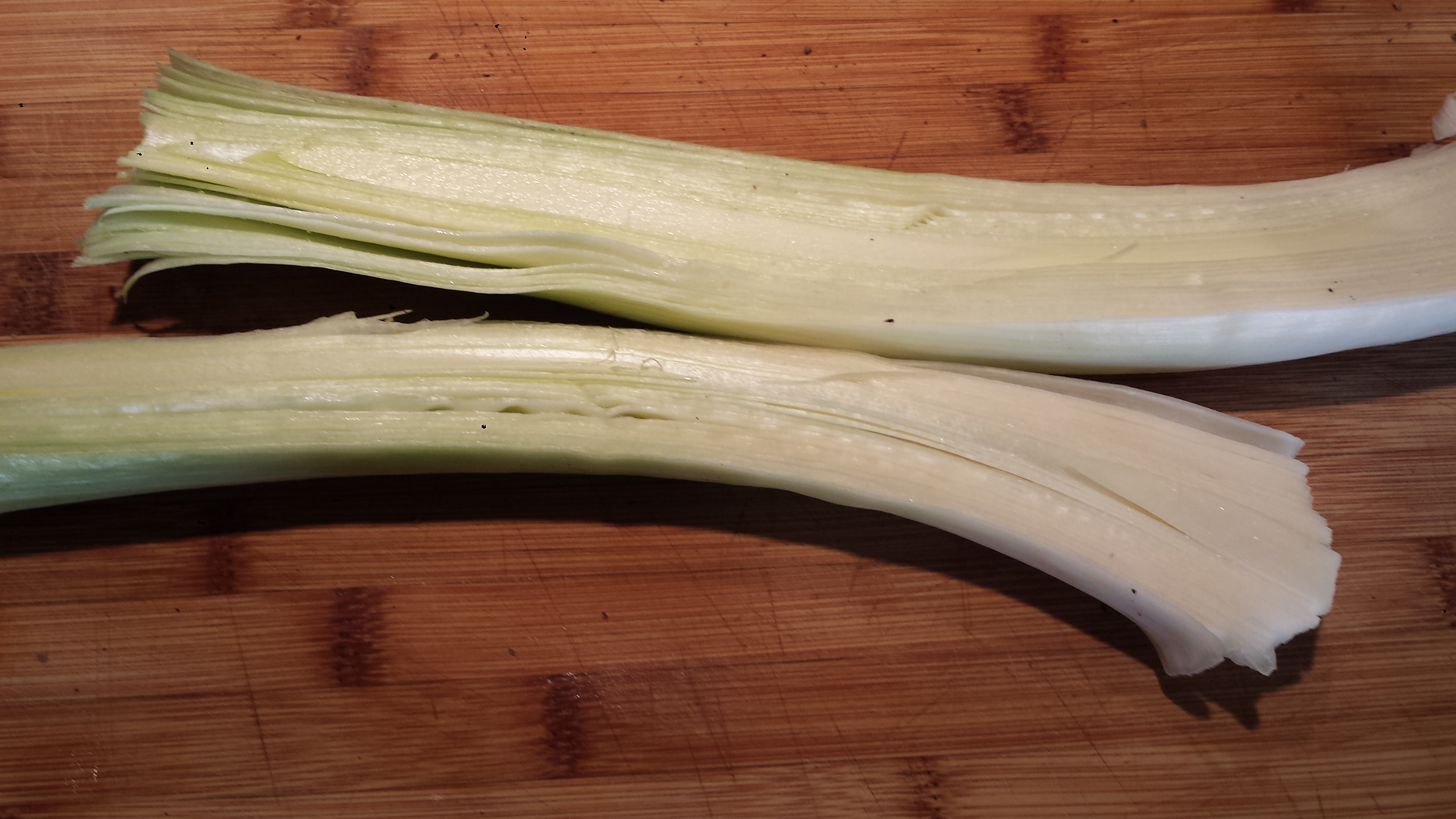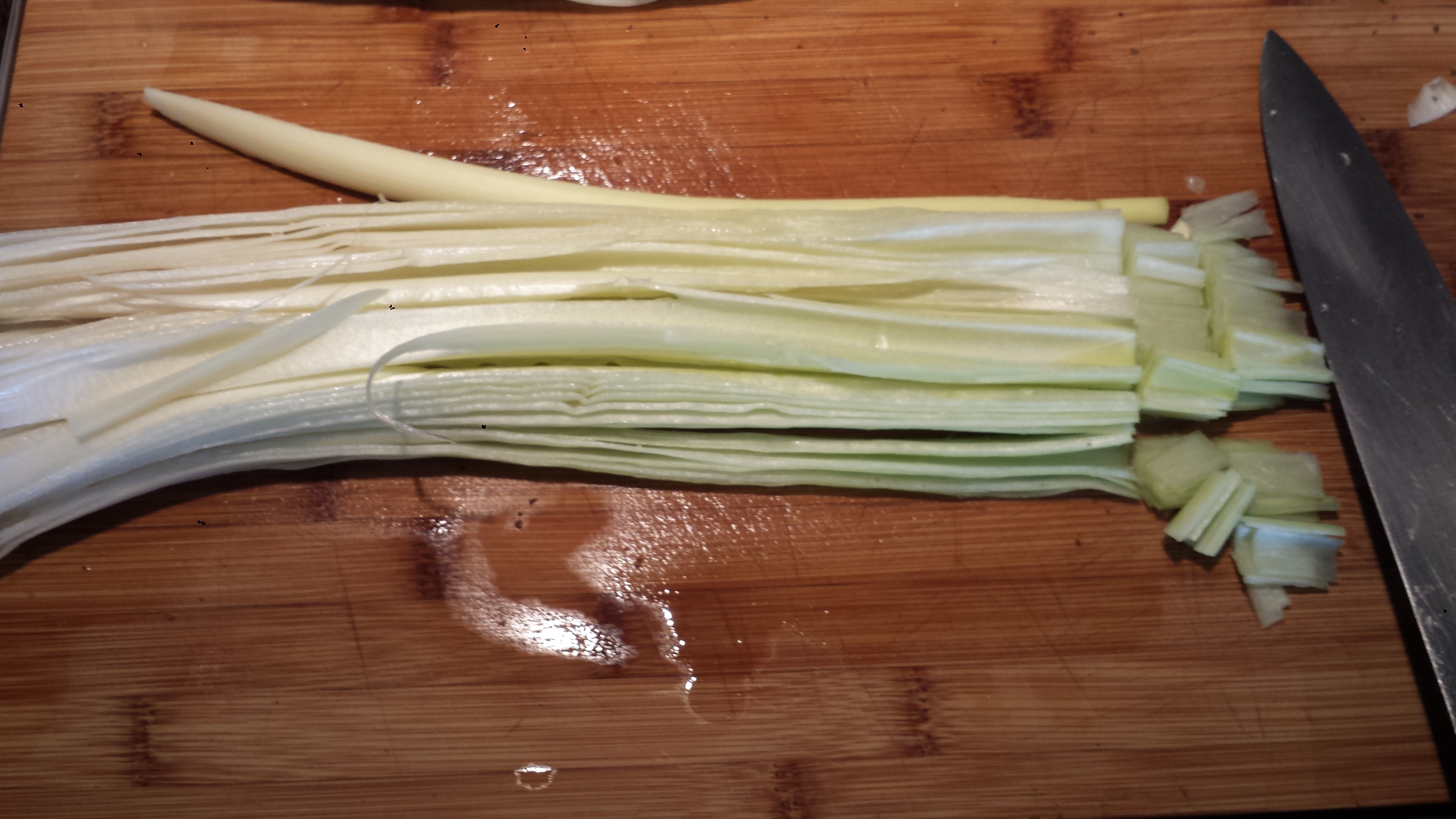 - While the potatoes are cooking, remove the root and dark green ends of the leek and slice in half lengthwise. Clean by running water between the layers (fanning them like a deck of cards) to remove any dirt. Slice leeks into strips lengthwise and then chop by slicing crosswise.