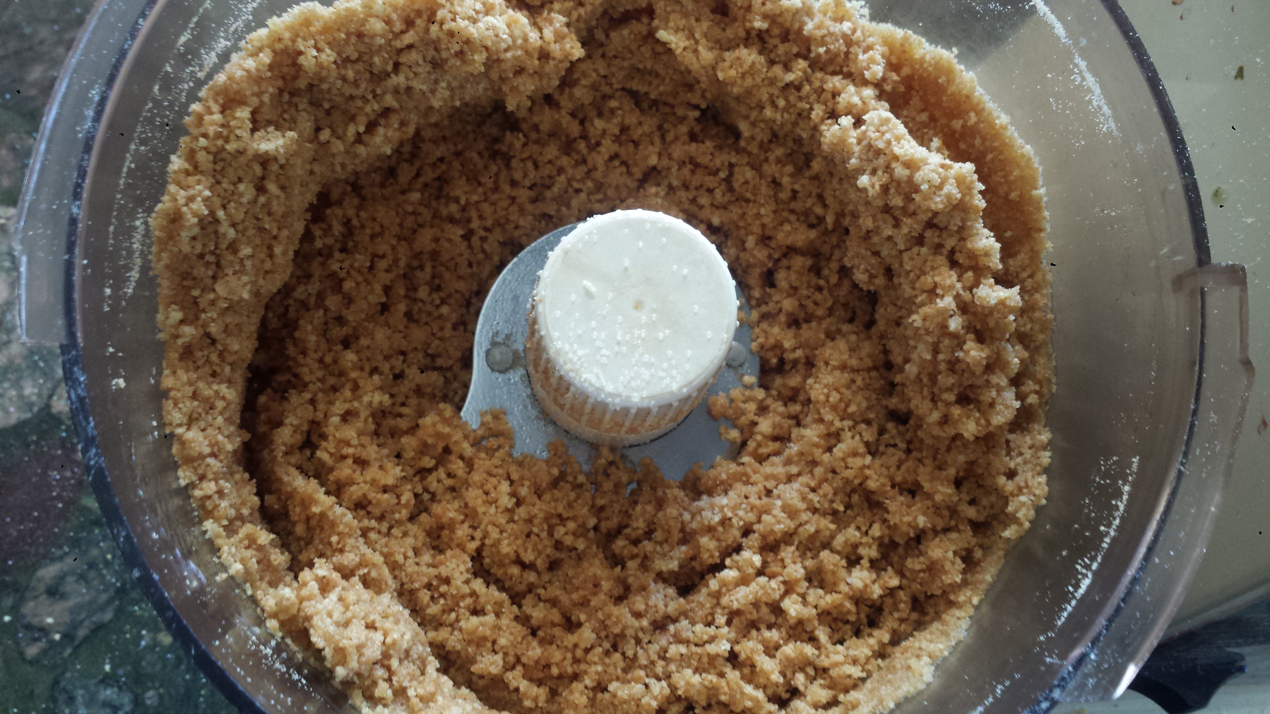- If you are using graham cracker crumbs, combine them with the sugar and stir in melted butter. If you are using graham crackers, break them into smaller pieces and process in a food processor or blender into crumbs. Add sugar and melted butter and process on low until combined. The mixture should easily form a ball when pressed together but should not be wet. Add another couple of Tablespoons of melted butter if its too crumbly.