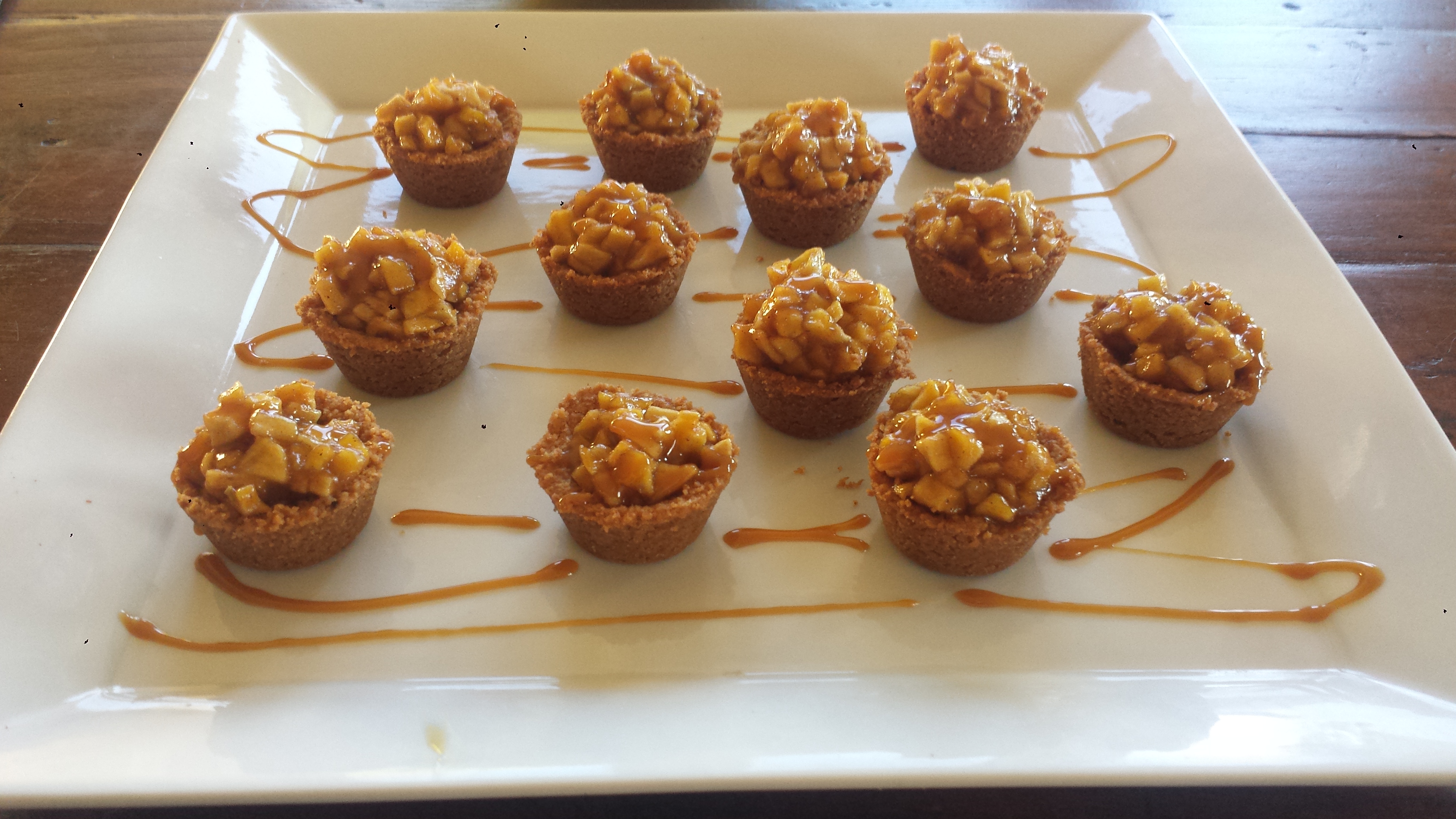 It’s Apple Harvest time! And you know what that means… Dessert. How about a twist on the traditional apple pie? I don’t mean to knock America’s favorite dessert, because I will make a couple of those too this season, but I have been on a kick for mini or two-bite appetizers and desserts lately. This one is definitely a winner! Finely diced sweet apples with cinnamon, nutmeg, sugar and lemon juice sauteed to tender deliciousness, then spooned into graham cracker cups and topped with a drizzle of salted caramel. All I can say is, yum!