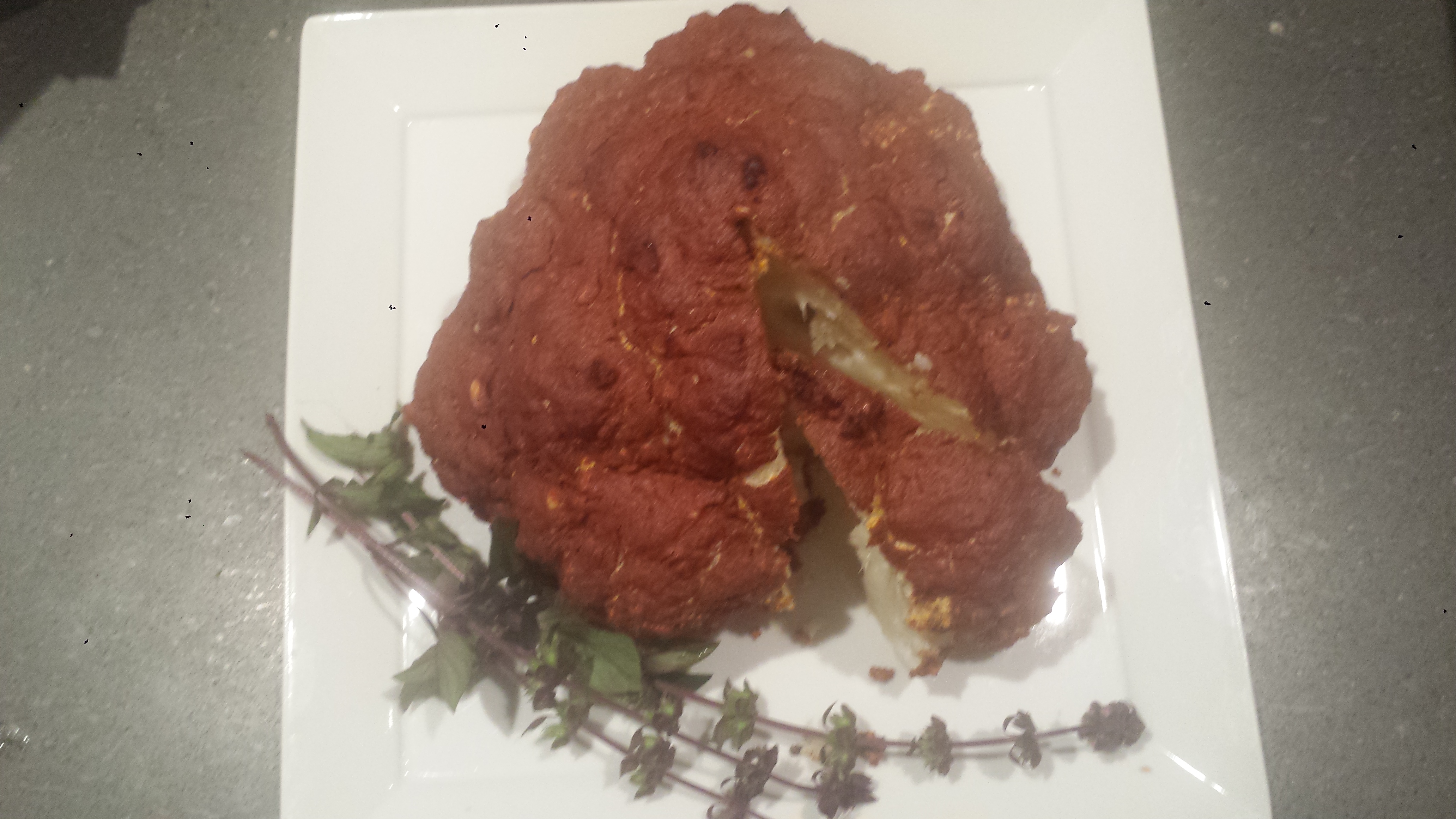 I have called cauliflower a vegetable chameleon before because it is so adaptable and a great substitute for many less healthy ingredients, so I decided to take it a step further and prepare it like a ‘meat’ for roasting. I removed the stem and leaves, brushed the outer head with a thick spicy sauce made with chili powder, cumin, garlic and cayenne pepper and then roasted in a hot oven for almost an hour. The sauce becomes a spicy and yummy crust and the interior is creamy goodness. I served it in wedges. Yum!
