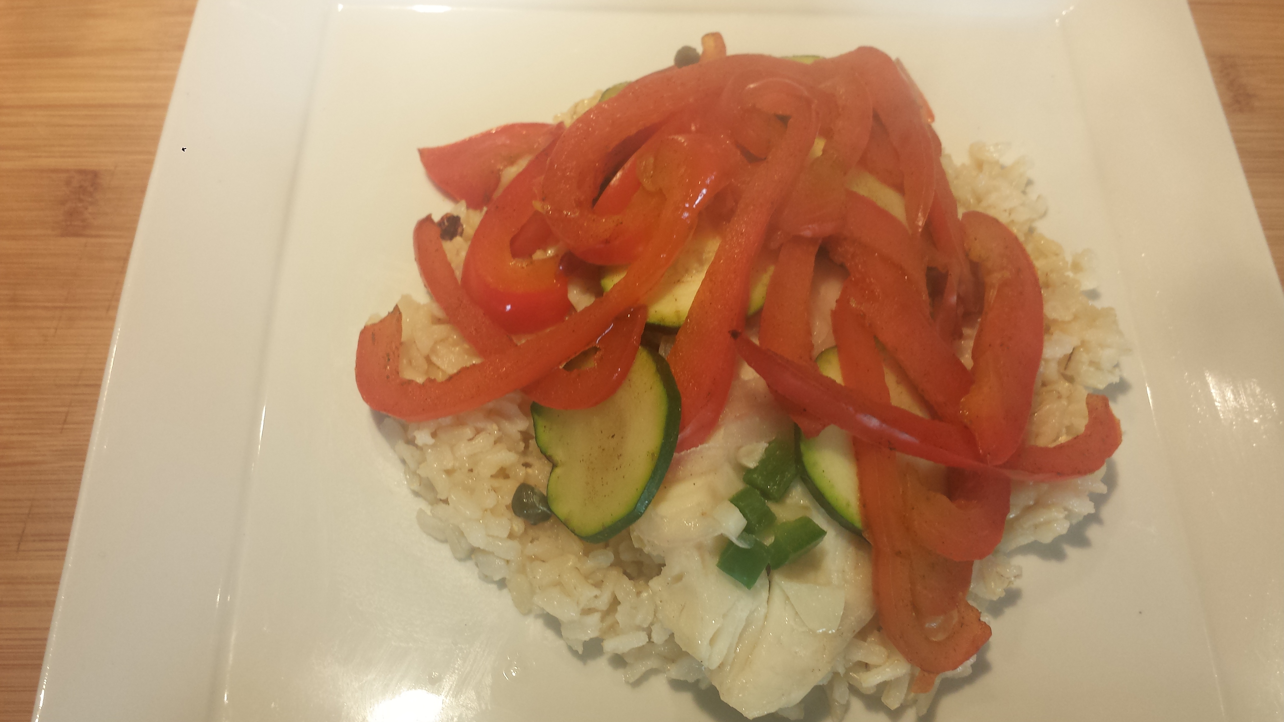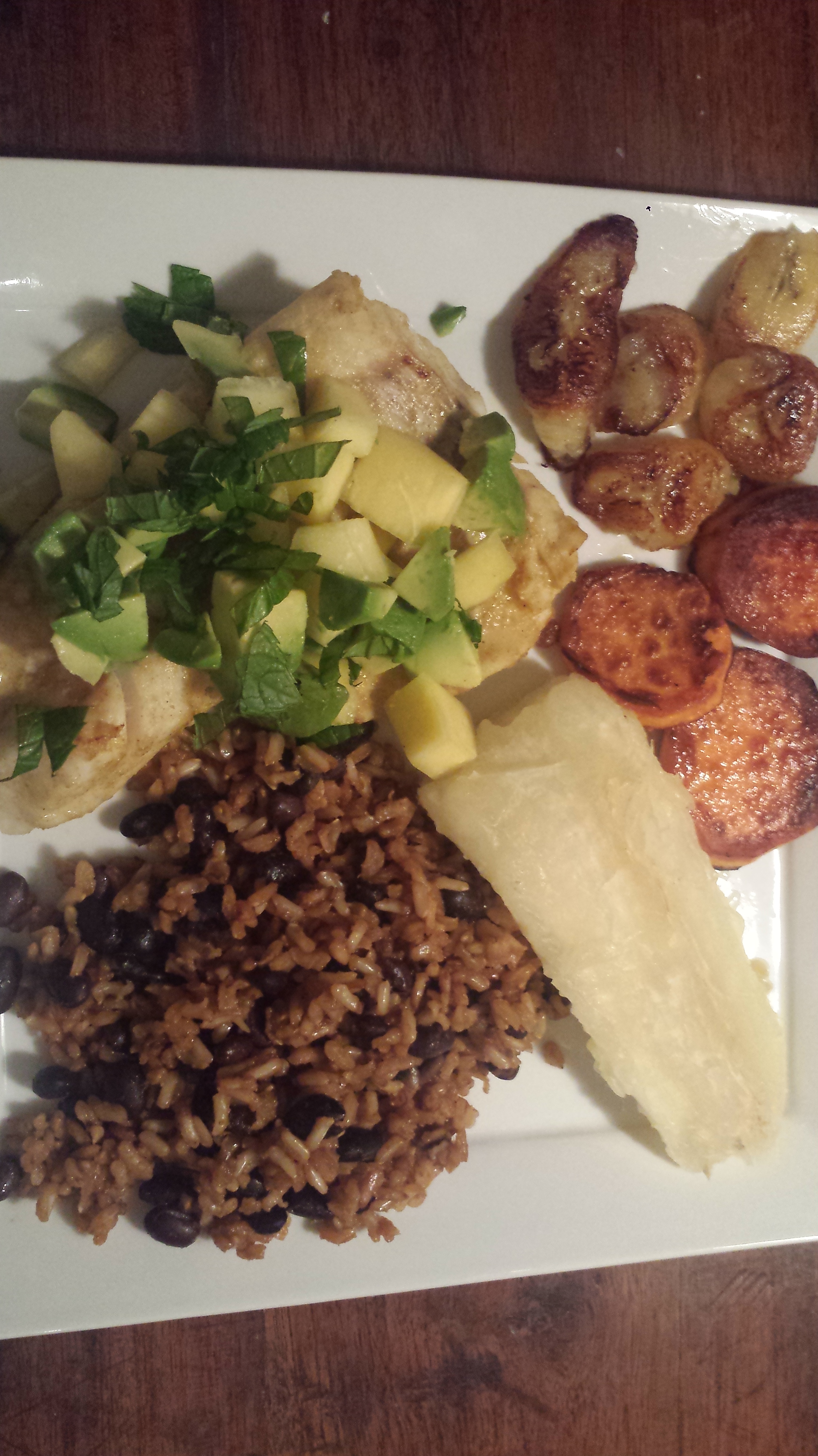 After spending a week sampling food in Cuba, I couldn’t wait to get home and try some of my favorites. I had an opportunity to try many types of fish, Bass, Pargo (red snapper) and Dorado (mahi mahi). One of my favorite preparations included fish seasoned with Mojo, which is a very popular sour orange/garlic/herb sauce topped with a combination of fruit and vegetables. Mojo can also be cooked with chopped onions and used as a dipping sauce. I topped the fish here with chopped avocado and mango which go nicely with the Mojo sauce.