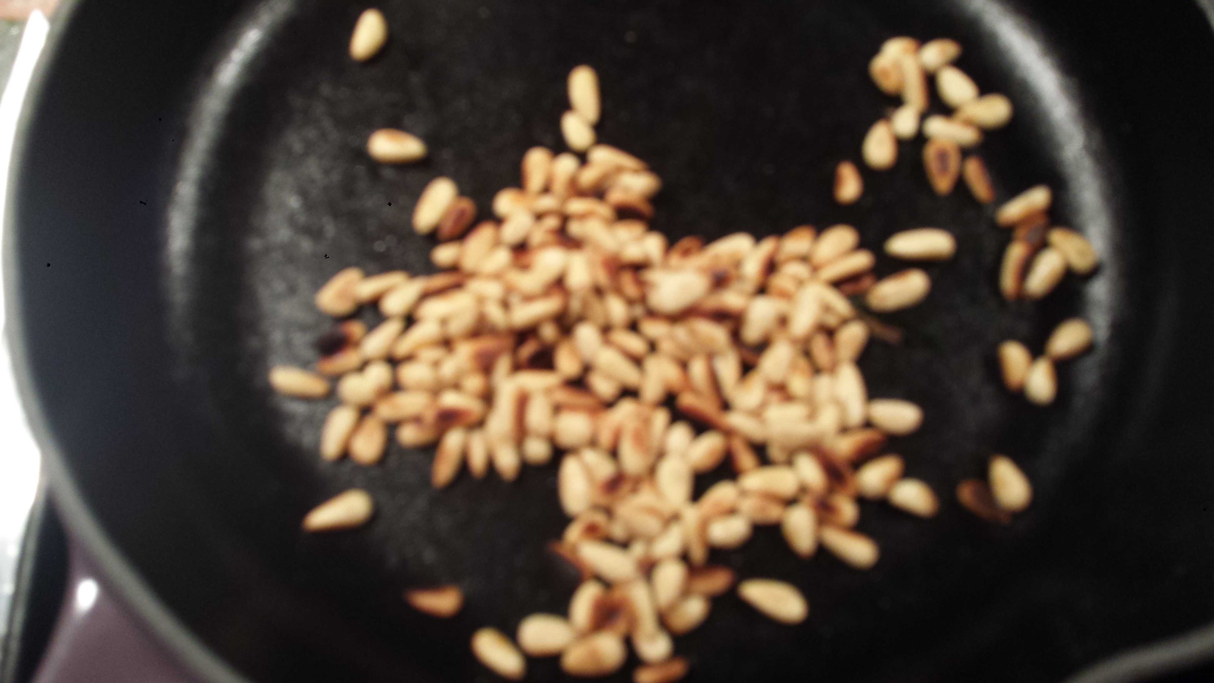- Toast 1/4 cup pine nuts in a dry pan over medium heat until golden. Let cool.