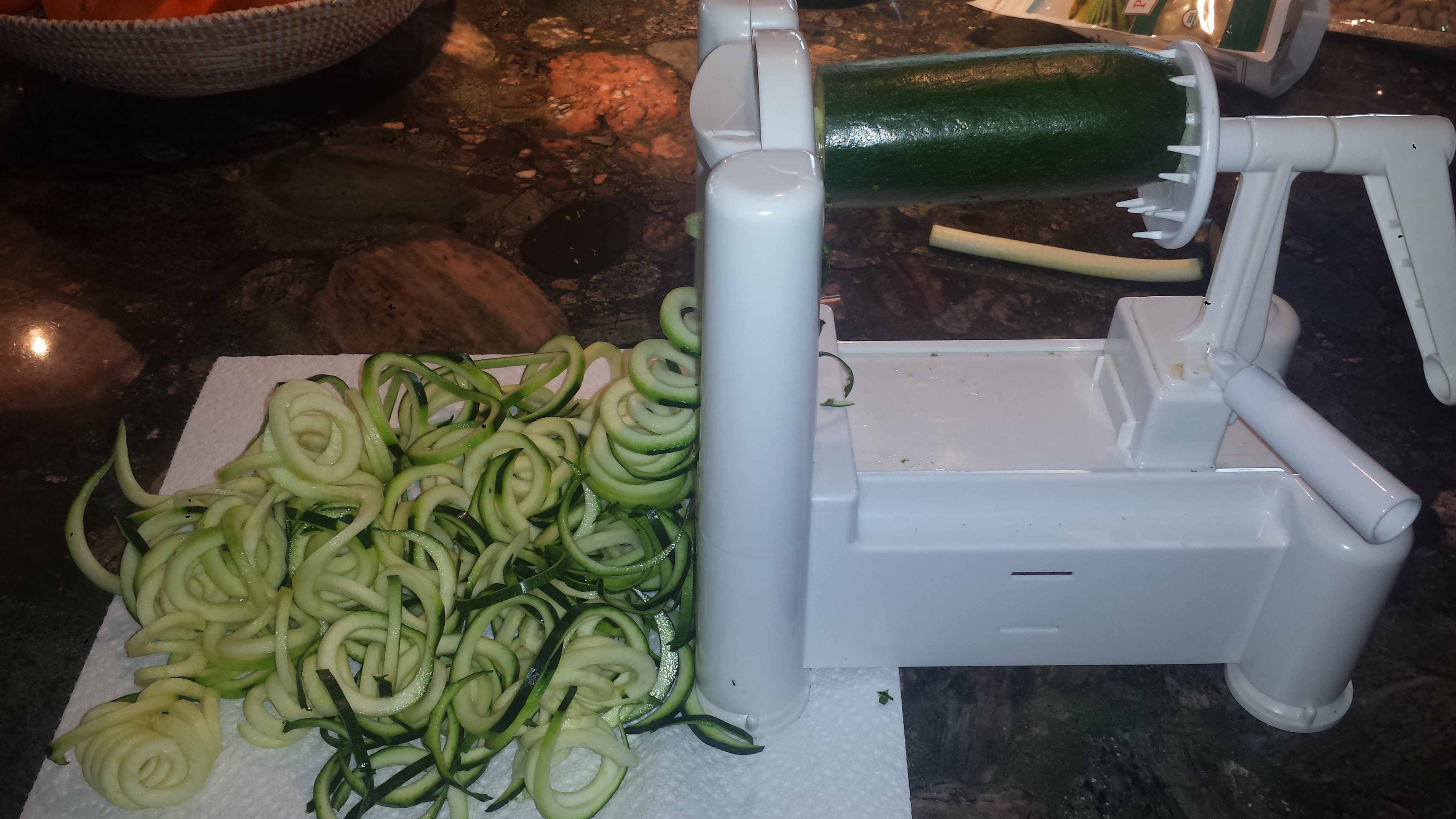 Making zoodles is easy if you have a spiralizer, and FUN! If you have a picky eater who won’t eat anything green, you can peel the zucchini first to remove the offending green, then spiralize into beautiful ‘noodles’ that may fool even the pickiest of eaters. I wish I had known about zoodles back in the day when my little boys only ate pasta with butter! I prefer keeping the peel on since so many of the nutrients are in or right under the skin, but any nutrients is better than none…