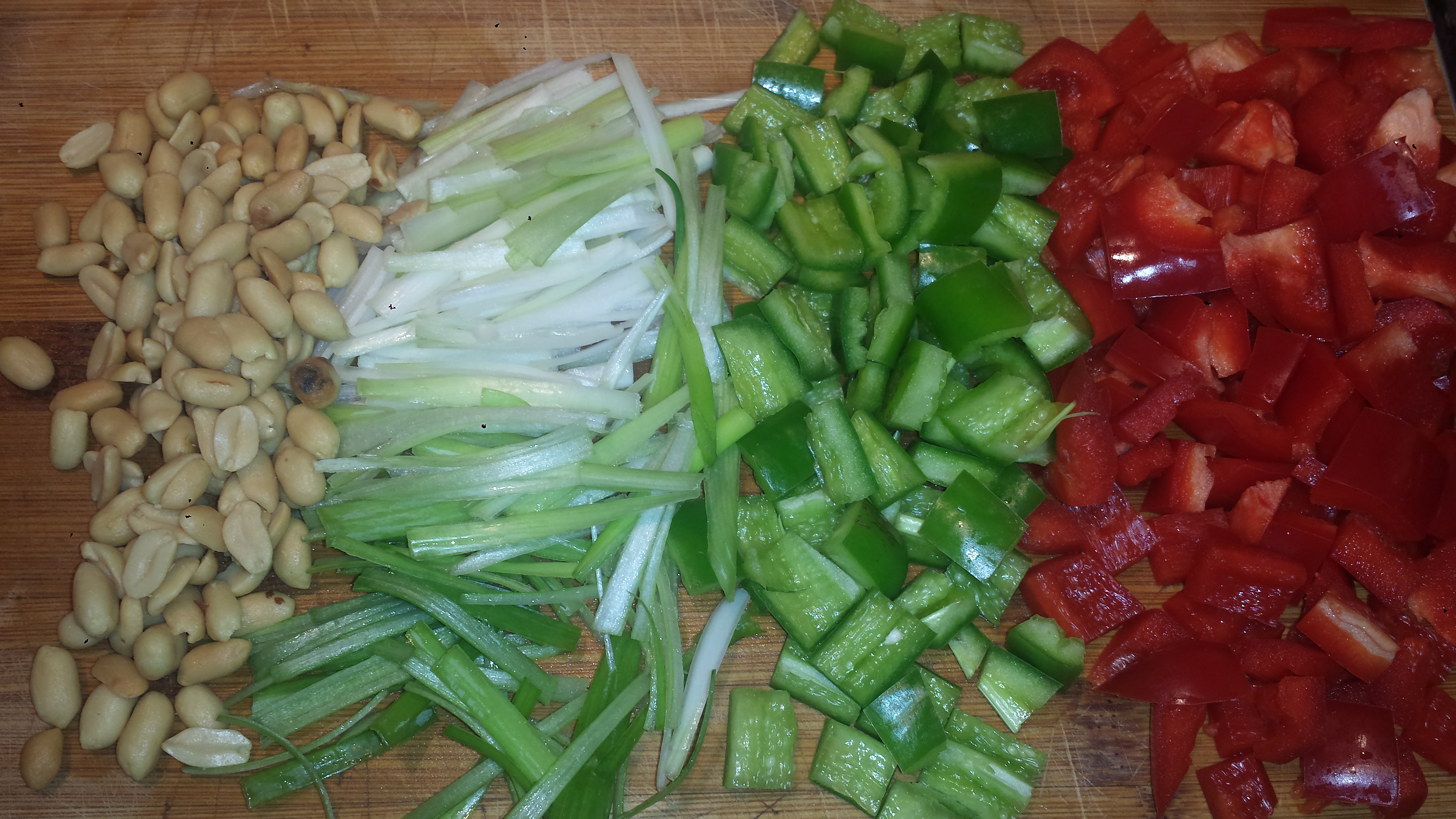 - Cut bell peppers into 1/2 inch dice. Measure out peanuts and roughly chop them or leave them whole.