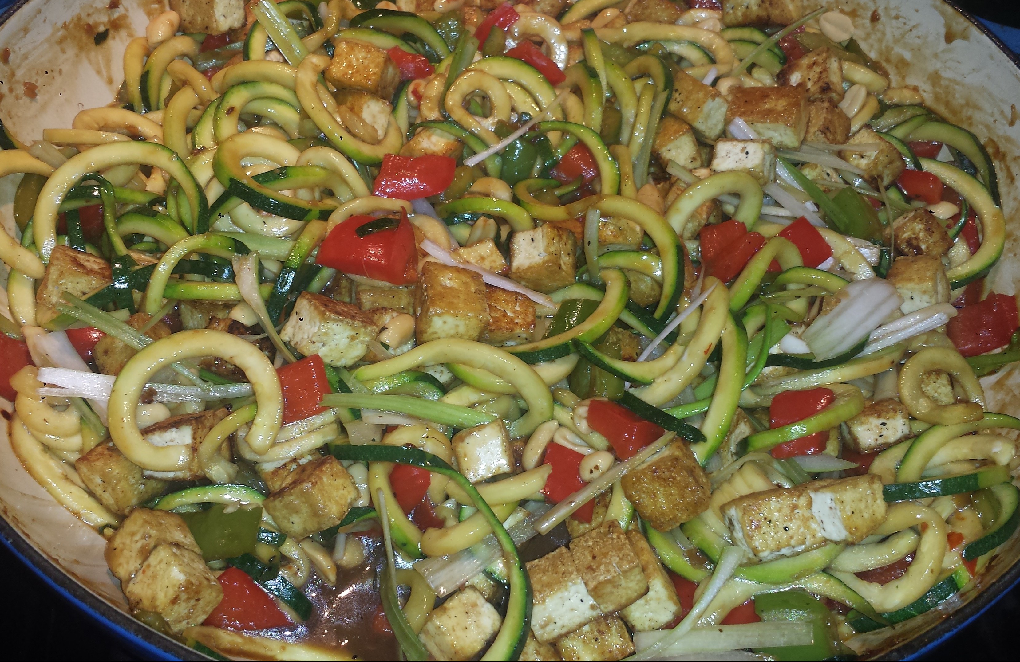 - Once zucchini is cooked to your liking, add the tofu, half of the peanuts and scallions and stir to combine.